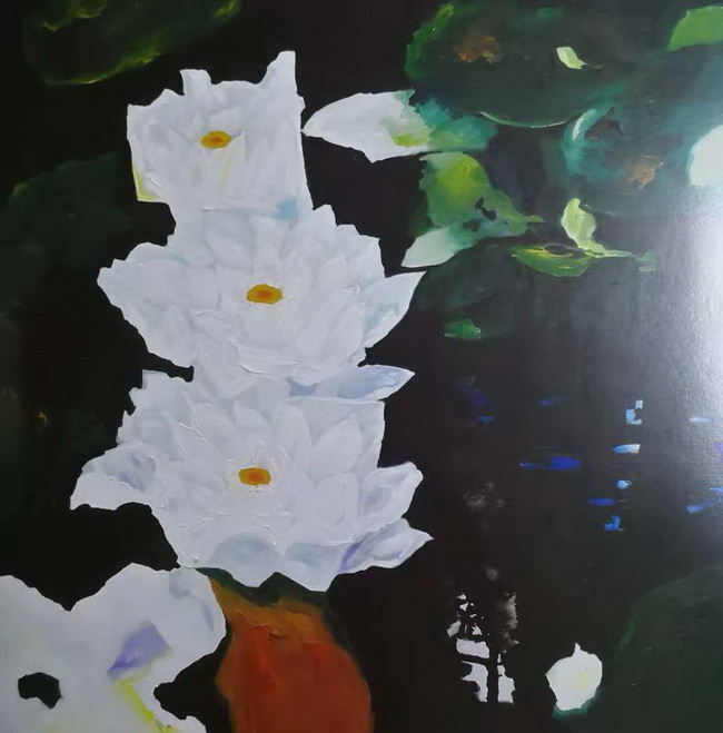 張玉馨老師有一個(gè)《西觀荷塘》系列,就是將水墨境界移植到油畫、綜合材料的創(chuàng)作中,運(yùn)用光影對比,讓荷塘景色在抽象與具象中游走,花葉間,隱匿萬種風(fēng)情。實(shí)際上,張玉馨已經(jīng)有意無意地把自己融進(jìn)了她所鐘愛的荷花里了。據(jù)了解,除了繪畫外,張玉馨還善于書法、篆刻,又涉獵詩歌。多種藝術(shù)的匯集,為她的藝術(shù)創(chuàng)作提供了廣闊空間。評論界認(rèn)為其作品是“將中國的古典與巴黎的浪漫進(jìn)行了完美的融合”。