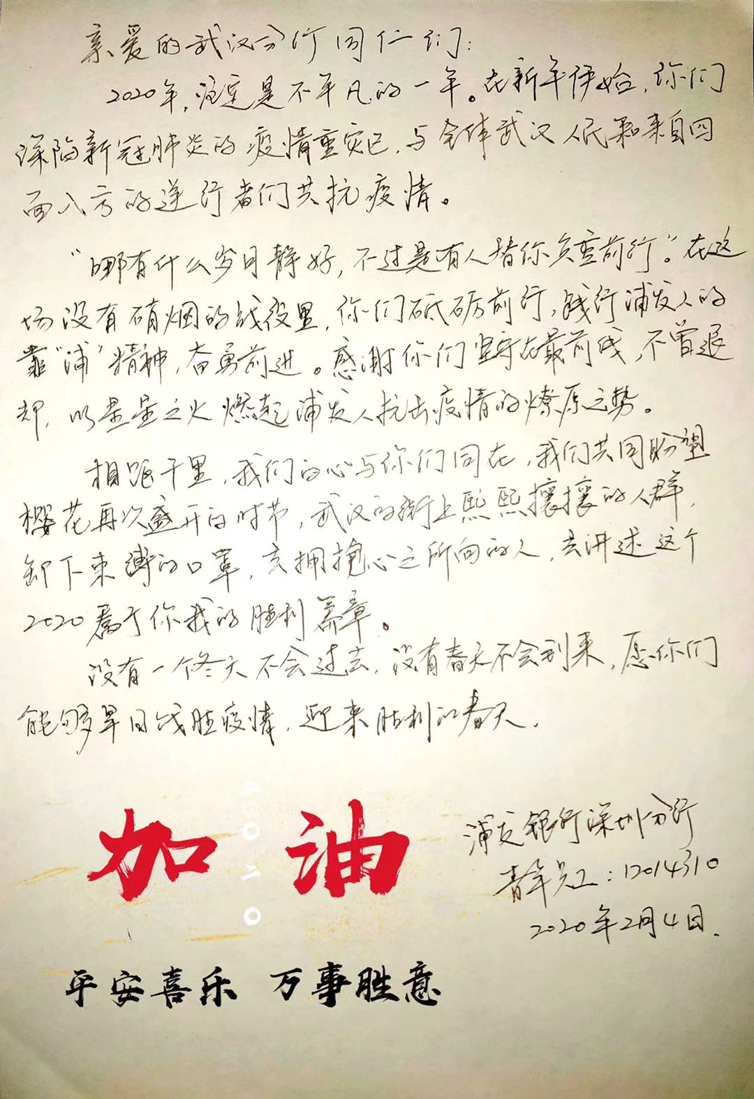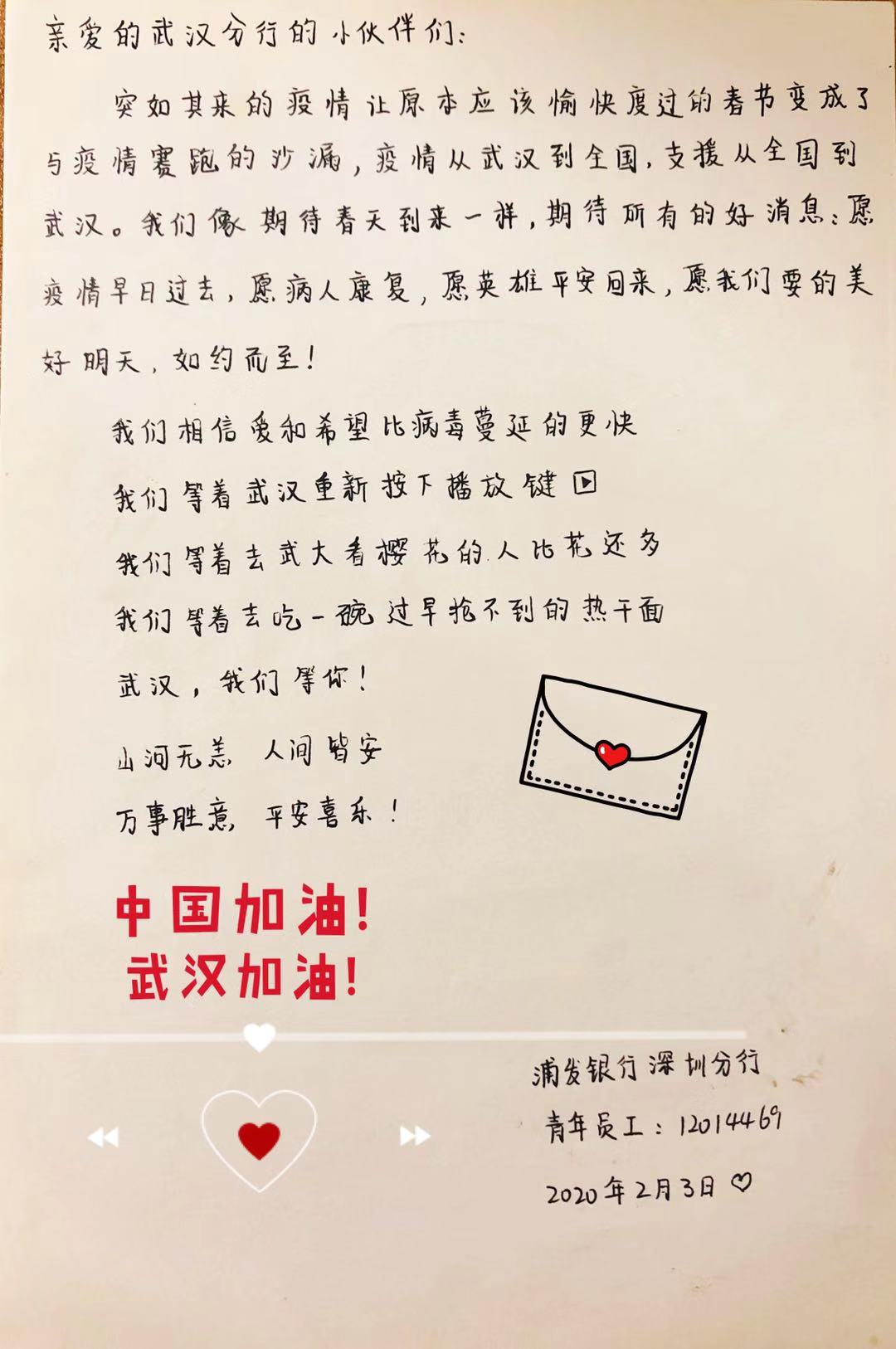 2月3日,浦發(fā)銀行深圳分行團委向全體青年員工發(fā)出了一封倡議書。在倡議書中,該行團委號召廣大團干部、團員青年立即行動,充分發(fā)揮黨的助手和后備軍作用,展現(xiàn)青年突擊隊作為,為堅決打贏疫情防控阻擊戰(zhàn)貢獻力量,并向青年提出三個要求:“堅定信心不迷茫,聽黨指揮勇?lián)敗薄ⅰ翱茖W防范不信謠,眾志成城控疫情”、“居家辦公不離崗,服從指揮勇?lián)敗?。當日,浦發(fā)銀行深圳分行發(fā)起了給武漢分行同事寄送家書的活動,該行全體青年手寫家書,圖文并茂、紙短情長,表達了對疫區(qū)“戰(zhàn)友們”最深切的關(guān)愛和鼓勵,身體力行做好他們堅強的后盾。