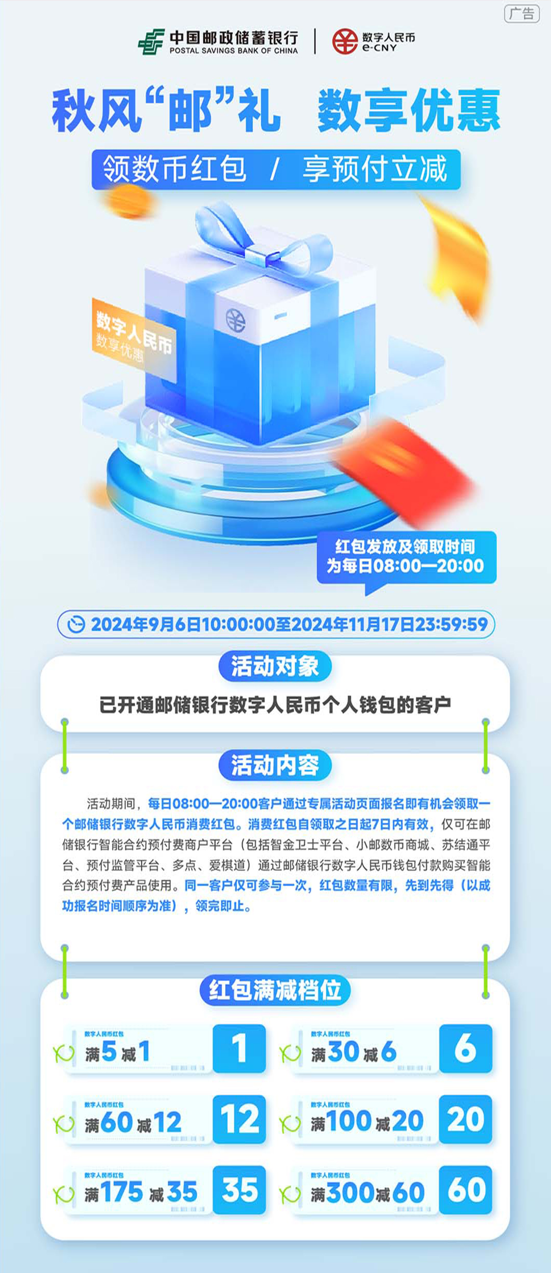 2024年9月6日10:00至2024年11月17日23:59,已開(kāi)通郵儲(chǔ)銀行數(shù)字人民幣錢(qián)包的客戶(hù),活動(dòng)期間,每日08:00-20:00客戶(hù)通過(guò)專(zhuān)屬活動(dòng)頁(yè)面報(bào)名即有機(jī)會(huì)領(lǐng)取一個(gè)郵儲(chǔ)銀行數(shù)字人民幣消費(fèi)紅包。消費(fèi)紅包自領(lǐng)取之日起7日內(nèi)有效,僅可在郵儲(chǔ)銀行智能合約預(yù)付費(fèi)商戶(hù)平臺(tái)(包括智金衛(wèi)士平臺(tái)、小郵數(shù)幣商城、蘇結(jié)通平臺(tái)、預(yù)付監(jiān)管平臺(tái)、多點(diǎn)、愛(ài)棋道)通過(guò)郵儲(chǔ)銀行數(shù)字人民幣錢(qián)包付款購(gòu)買(mǎi)智能合約預(yù)付費(fèi)產(chǎn)品使用。同一客戶(hù)僅可參與一次,紅包數(shù)量有限,先到先得(以成功報(bào)名時(shí)間順序?yàn)闇?zhǔn))領(lǐng)完即止。