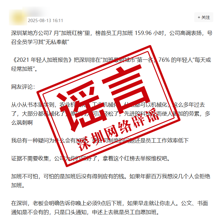 近日,一則《關于加班的通報表揚》在社交平臺引發(fā)熱議。部分網帖將涉事企業(yè)與深圳強行關聯(lián),冠以“深圳某公司”名義進行傳播,并稱深圳存在普遍的加班現(xiàn)象。經核實,涉事企業(yè)非深圳企業(yè)。