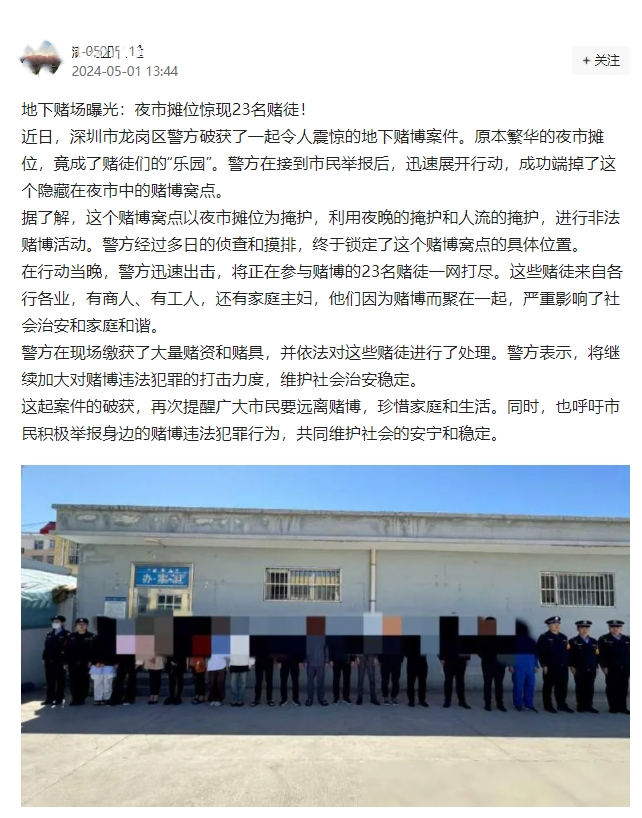 有網(wǎng)民在某社交平臺(tái)發(fā)帖稱:“近日,深圳市龍崗區(qū)破獲了一起令人震驚的地下賭博案件。原本繁華的夜市攤位,竟成了賭徒們的‘樂(lè)園’?!饼垗弲^(qū)相關(guān)部門(mén)第一時(shí)間對(duì)該內(nèi)容進(jìn)行核查,確認(rèn)此消息不實(shí),龍崗區(qū)沒(méi)有發(fā)生此類案件。