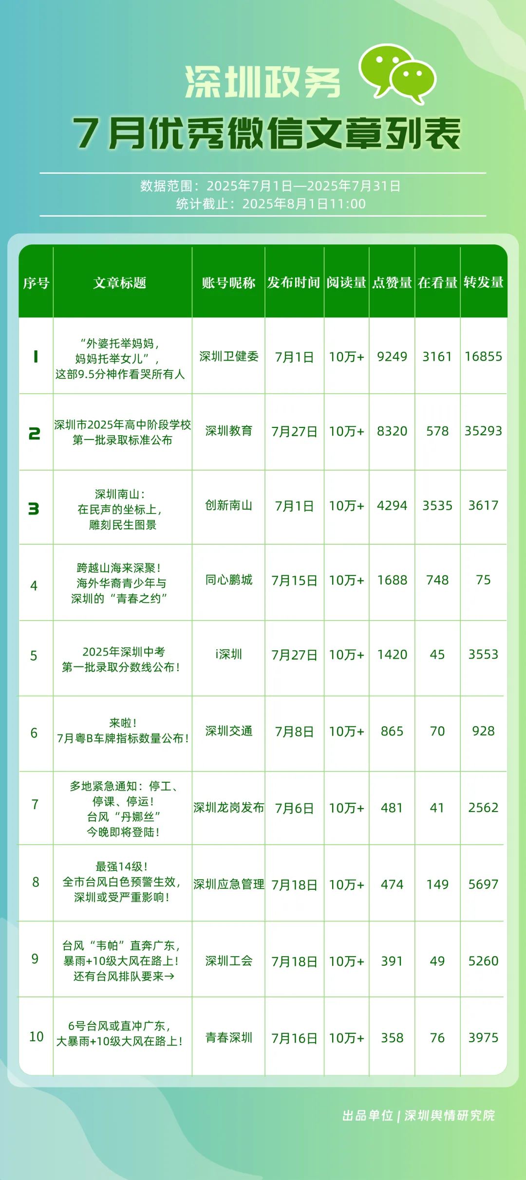 7月,30個政務(wù)微信公眾號入選“深圳優(yōu)秀政務(wù)微信公眾號”榜單,其中包括“深圳衛(wèi)健委”“深圳龍崗發(fā)布”“幸福福田”“創(chuàng)新南山”“i深圳”“深圳教育”“青春深圳”“深圳工會”“深圳光明”“濱海寶安”等。7月,“深圳衛(wèi)健委”內(nèi)容專業(yè)性與傳播力優(yōu)勢穩(wěn)固,整體表現(xiàn)保持較高水平,位于榜首;“深圳龍崗發(fā)布”聚焦民生服務(wù)與區(qū)域活動宣傳,實現(xiàn)傳播效果提升,位居第二;“幸福福田”表現(xiàn)同樣不俗,排名第三?!皠?chuàng)新南山”“深圳教育”“深圳工會”等也積極發(fā)布高質(zhì)量信息與服務(wù)內(nèi)容,能夠較好平衡內(nèi)容“質(zhì)”與“量”,排名有所提升。上榜微信公眾號依托特色優(yōu)勢深耕內(nèi)容創(chuàng)作,將優(yōu)質(zhì)內(nèi)容作為核心支撐,成為政務(wù)傳播領(lǐng)域的優(yōu)秀典范。