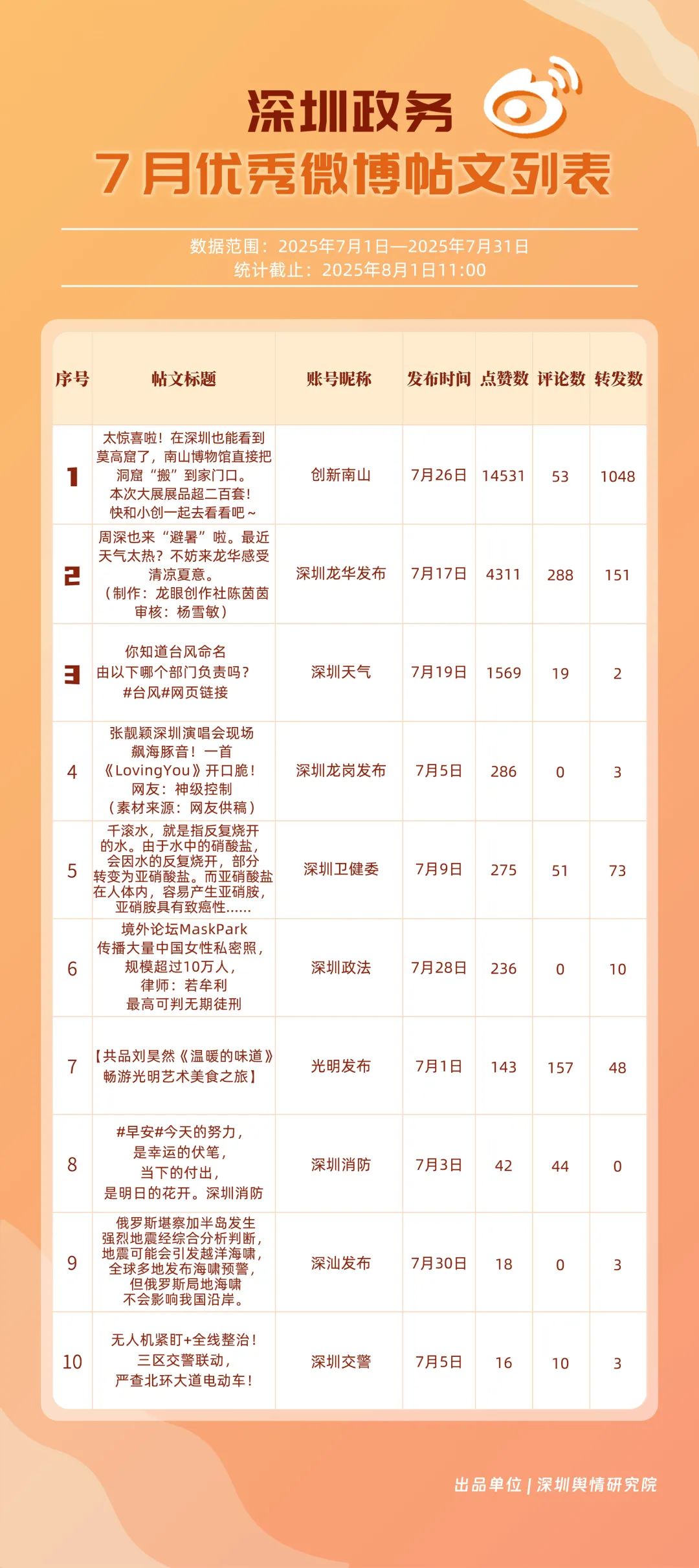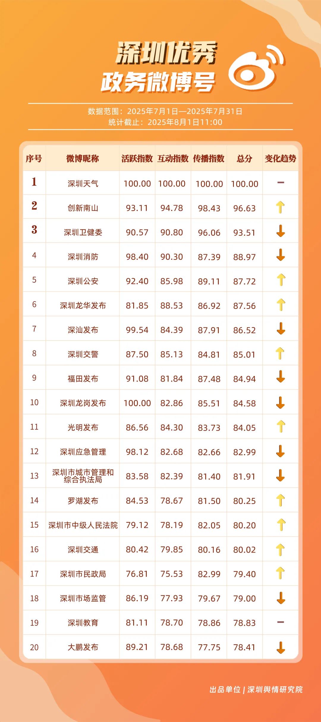 7月,“深圳天氣”“創(chuàng)新南山”“深圳衛(wèi)健委”“深圳消防”“深圳公安”“深圳龍華發(fā)布”“深汕發(fā)布”“深圳交警”“福田發(fā)布”“深圳龍崗發(fā)布”等20個賬號入選“優(yōu)秀政務(wù)微博號”。其中,“深圳天氣”以活躍、互動、傳播指數(shù)三項滿分,蟬聯(lián)榜首;“創(chuàng)新南山”以總分96.63躍居第二,排名呈上升趨勢;“深圳衛(wèi)健委”位列第三,評分也在90分以上,其科普信息持續(xù)獲得市民廣泛認可。以上優(yōu)秀的政務(wù)微博賬號精準貼合平臺的傳播規(guī)律,用獨特的賬號風(fēng)格展現(xiàn)各自特色與魅力。