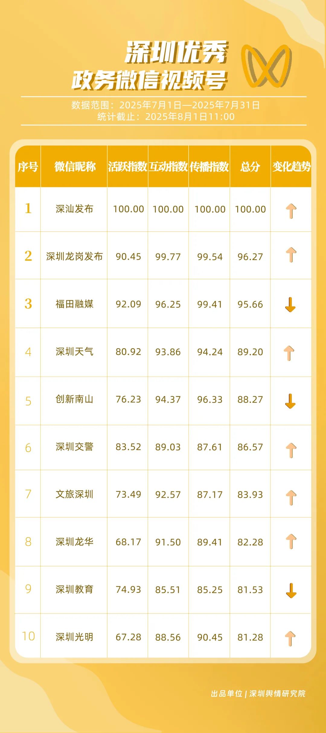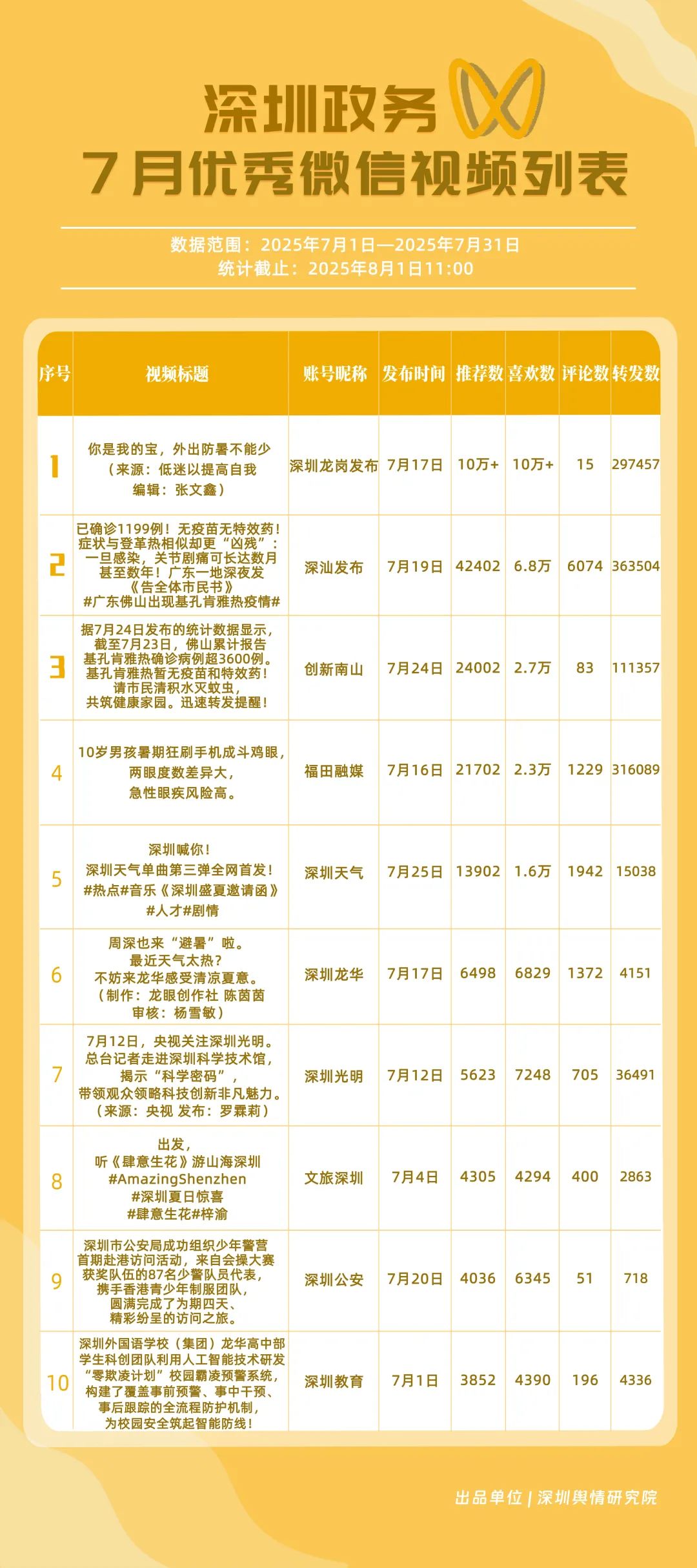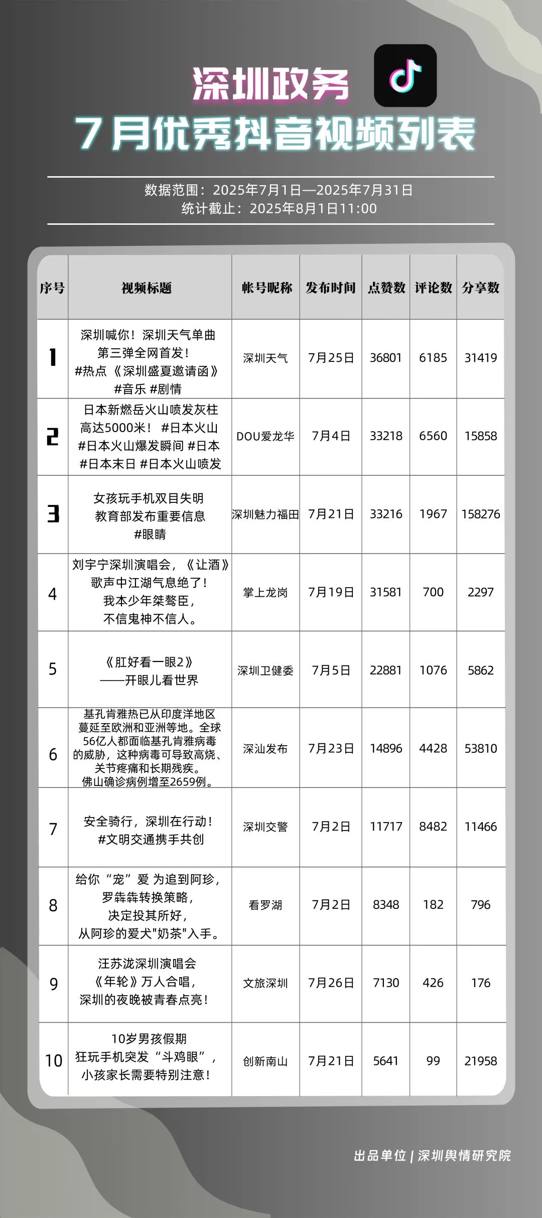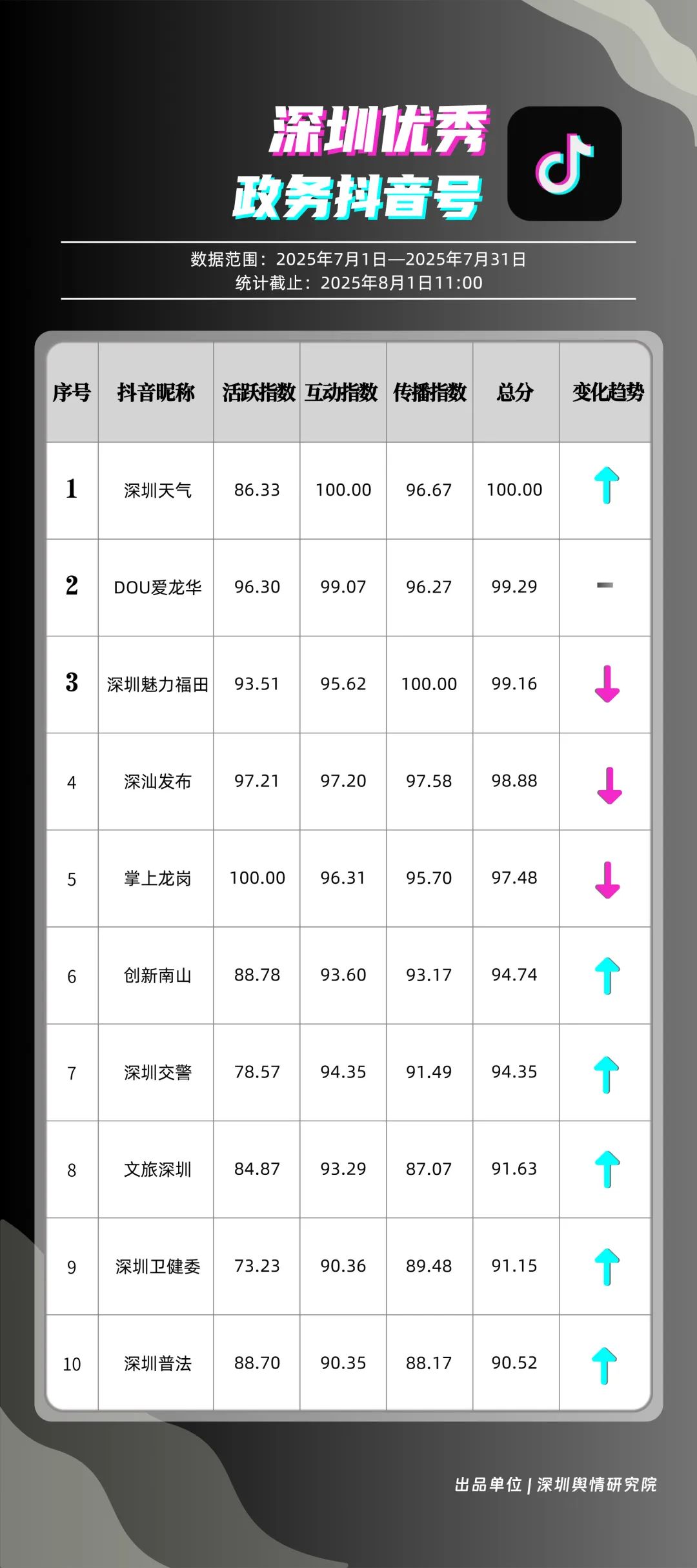 7月,“深圳天氣”“DOU愛龍華”“深圳魅力福田”“深汕發(fā)布”“掌上龍崗”“創(chuàng)新南山”“深圳交警”“文旅深圳”“深圳衛(wèi)健委”“深圳普法”共10個政務(wù)抖音號獲得“優(yōu)秀政務(wù)抖音號”稱號。其中,“深圳天氣”互動指標獲滿分,憑借氣象與趣味相結(jié)合的創(chuàng)新科普形式,領(lǐng)跑優(yōu)秀政務(wù)抖音號;“DOU愛龍華”“深圳魅力福田”分別位列第二、三名,通過聚焦網(wǎng)絡(luò)熱點、挖掘創(chuàng)意內(nèi)容,不斷提升傳播效能,展現(xiàn)出強大的政務(wù)新媒體影響力;“深汕發(fā)布”“掌上龍崗”“創(chuàng)新南山”等賬號緊隨其后,上榜的優(yōu)質(zhì)政務(wù)抖音號用短視頻語言強化傳播效果,展現(xiàn)了鮮明的賬號特色和風(fēng)采。