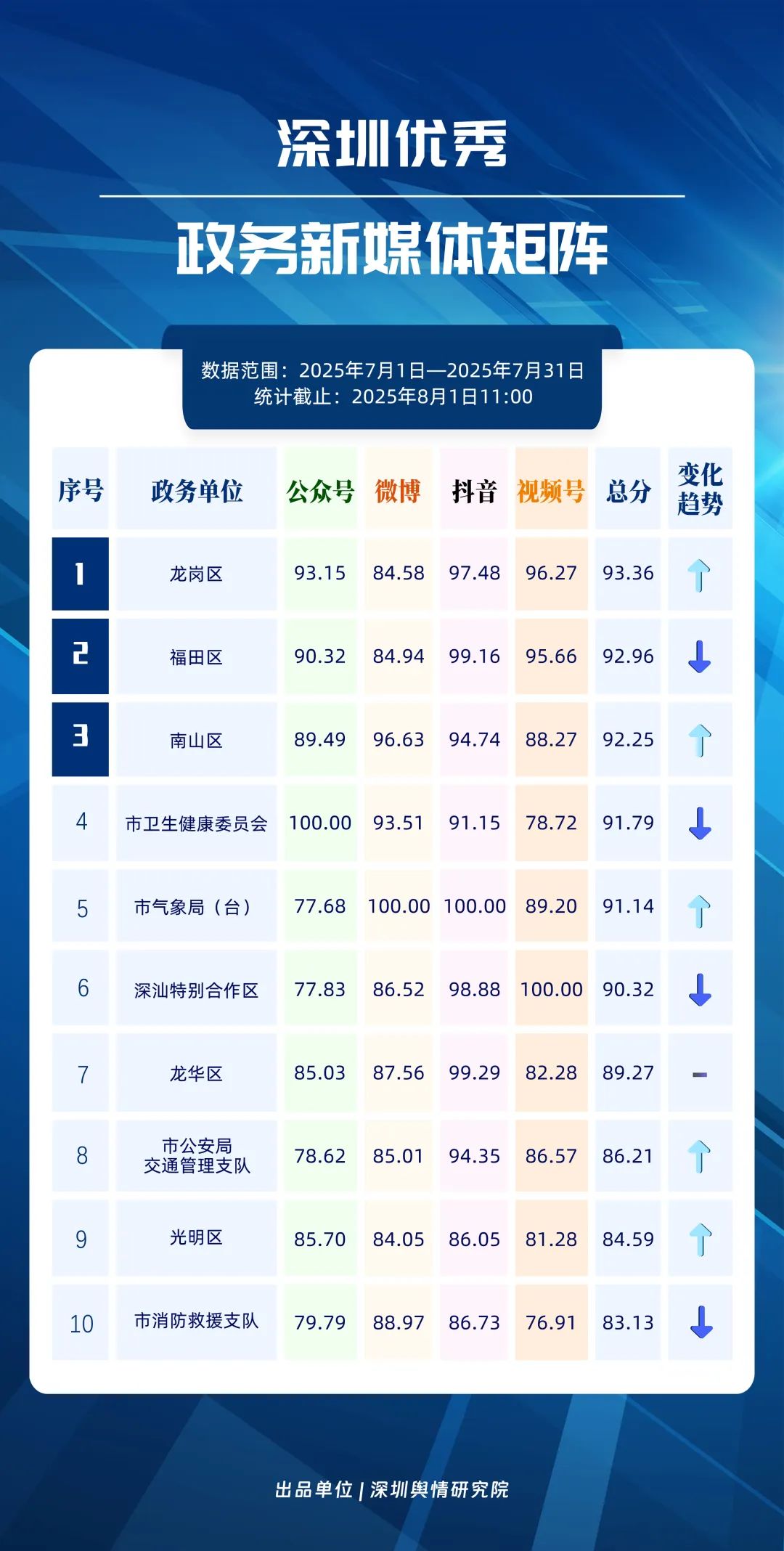 7月,深圳政務(wù)新媒體矩陣各展所長,為市民帶來豐富實用的信息服務(wù)。龍崗區(qū)、福田區(qū)、南山區(qū)、市衛(wèi)生健康委員會、市氣象局(臺)、深汕特別合作區(qū)、龍華區(qū)、市公安局交通管理支隊、光明區(qū)、市消防救援支隊的新媒體矩陣入選“深圳優(yōu)秀政務(wù)新媒體矩陣”榜單。值得關(guān)注的是,龍崗區(qū)新媒體矩陣在7月著力提升內(nèi)容質(zhì)量,于抖音和微信視頻號平臺得分顯著提高,成功登頂;福田區(qū)新媒體矩陣在抖音平臺表現(xiàn)突出,位列榜單第二;南山區(qū)新媒體矩陣則在微博和抖音平臺保持評分優(yōu)勢。此外,市氣象局(臺)、市公安局交通管理支隊和光明區(qū)的排名也實現(xiàn)明顯上升,體現(xiàn)出政務(wù)新媒體矩陣整體競爭力持續(xù)增強。