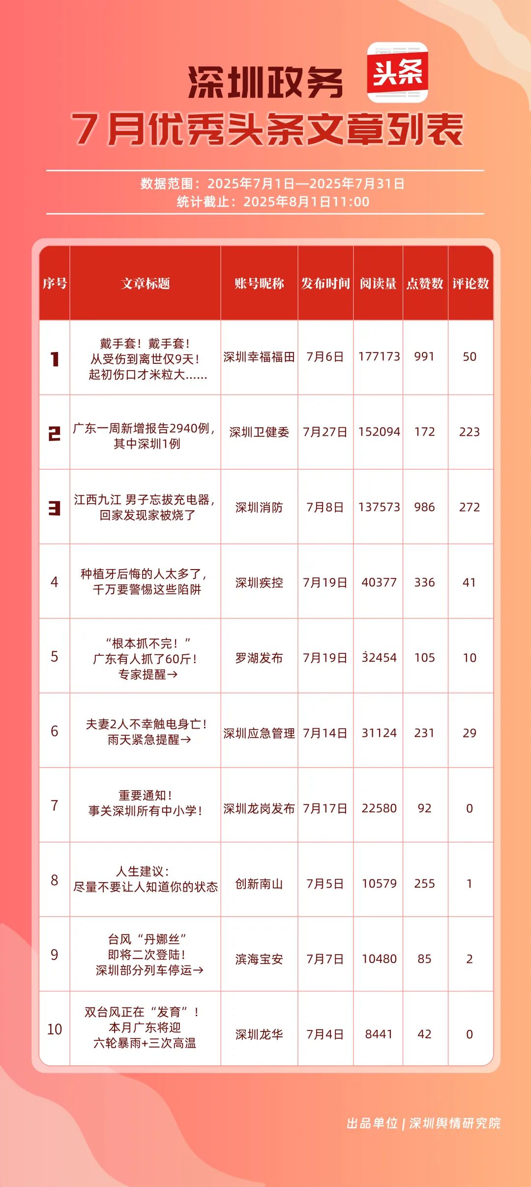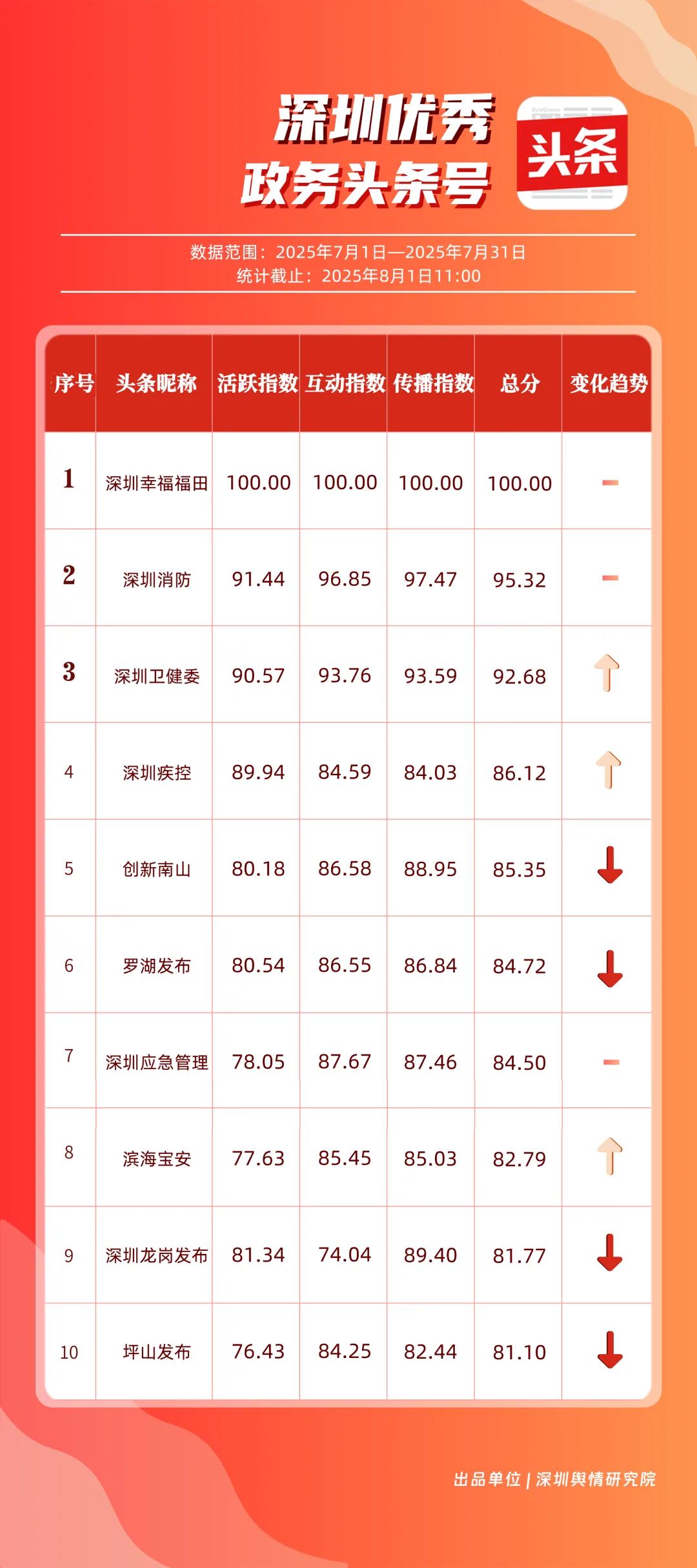 7月,“深圳幸福福田”“深圳消防”“深圳衛(wèi)健委”“深圳疾控”“創(chuàng)新南山”“羅湖發(fā)布”“深圳應(yīng)急管理”“濱海寶安”“深圳龍崗發(fā)布”“坪山發(fā)布”共10個政務(wù)頭條號入選“優(yōu)秀政務(wù)頭條號”榜單?!吧钲谛腋8L铩薄吧钲谙馈睉{借優(yōu)質(zhì)內(nèi)容持續(xù)吸引用戶關(guān)注,穩(wěn)居前二;“深圳衛(wèi)健委”表現(xiàn)亮眼,評分達92.68分,排名較6月有所上升;“深圳疾控”同樣進步明顯,在疾病預(yù)防控制信息傳播上發(fā)揮了重要作用。“創(chuàng)新南山”“羅湖發(fā)布”“深圳應(yīng)急管理”等上榜賬號,也各展所長,始終將優(yōu)質(zhì)內(nèi)容作為核心抓手,成為政務(wù)新媒體領(lǐng)域內(nèi)容創(chuàng)作與傳播的典范。