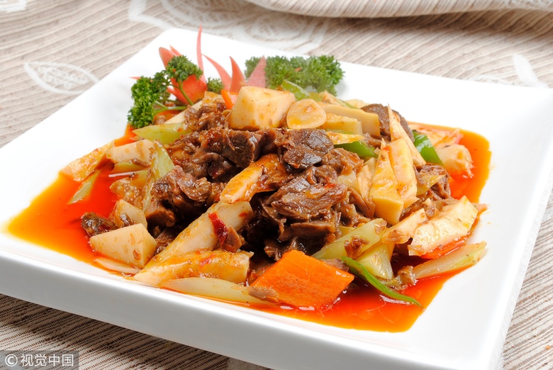 6、坐鍋熱油,爆香蒜末、姜末、紅椒碎,下入春筍粒,略翻炒;下入黑木耳,加適量鹽,翻炒片刻;加入腌制好的豬肉碎,用鍋鏟將肉碎快速翻散,與其它食材一起翻炒片刻,下入雞蛋碎,加適量生抽、老抽,加一點高湯或溫水,燜片刻,待湯汁快要收干,即可起鍋裝盤。(可以單獨做菜,也可以是粉、面的蓋澆炒碼)