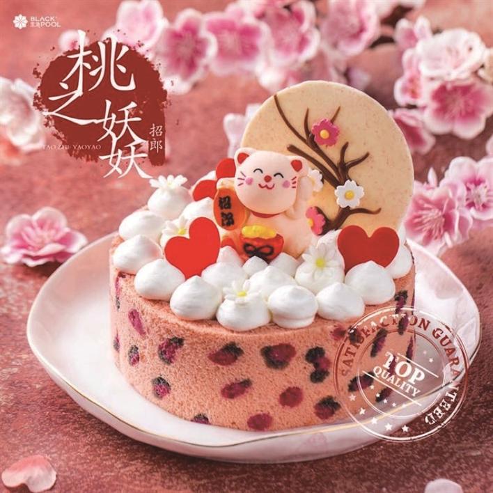 據(jù)黑池產(chǎn)品經(jīng)理介紹,“招郎蛋糕”是黑池最近重磅推出的新產(chǎn)品。蛋糕周圍覆盆子果干點(diǎn)綴而成的粉色豹紋,讓整個(gè)蛋糕充滿了野性魅惑又不失少女甜美。最為吸引眼球的,則是蛋糕表面,被桃花簇?fù)碇囊恢弧罢欣蛇鳌?。這只軟萌可愛的“招郎喵”,象征著,對得到這款蛋糕的人,最美好的祝愿,希望他們能夠遇到最好的愛情,找到心目中的那個(gè)他。