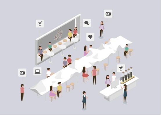 距離影響交往方式,美國人類學家愛德華·霍爾博士為人際交往劃分了四種距離,即公眾距離、社交距離、個人距離和親密距離。小尺度空間讓人親近,方便展開話題;大尺度的空間兼容并蓄,并有更多可能性。