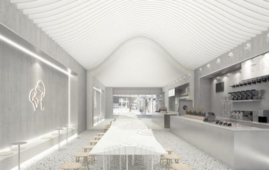 店中的桌子做成浮云形狀,山成為桌子的一部分,與天頂?shù)纳叫伟咨⌒雾斉镞b相呼應,“山外山”主題呼之欲出。喜茶·山外山的設計靈感來源于兩幅古畫——《春山瑞松圖》和《溪山行旅》。設計師把畫中的“山峰”感融入店內(nèi),現(xiàn)代化的同時富有詩意。讓茶客仿佛置身畫中,大夢一場,不知身在何方。