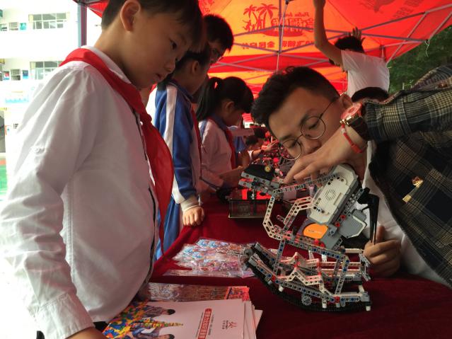 同期,愛匯百變教育科技有限公司也給同學(xué)帶來了炫酷多彩的編程大餐。通過對EV3編程機器人項目LEGO方針機械機構(gòu)以及LEGO圖形化編程展示,邀請現(xiàn)場同學(xué)進行對套件進行組裝、編程控制,普及編程和電磁感應(yīng)現(xiàn)象、電動基本原理、電路等物理知識,鍛煉學(xué)生科學(xué)創(chuàng)造思維,培養(yǎng)學(xué)科興趣。