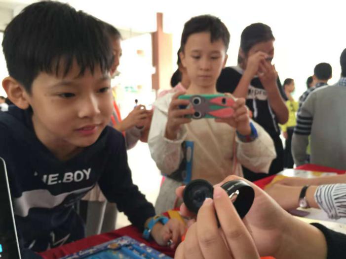 科普益智互動游戲精彩紛呈,深圳阿卡索資訊股份有限公司的華容道大闖關(guān)、筷子夾彈珠互動游戲極大激發(fā)了同學(xué)們的參與熱情。深圳市夢飛翔文化傳播有限公司及深圳諾必達節(jié)能環(huán)保有限公司的智能陪伴機器人能詩歌能朗誦,“通今博古”能答疑解惑,成為同學(xué)們的良師益友。各種技能培訓(xùn)在其中兩家學(xué)校同步開展,包括中廣和(深圳)科技有限公司的兒童護理實用技能、深圳光影教育投資有限公司的手機和單反使用講座、深圳市海文深生物科技有限公司的牙膏制作工藝展示等項目,讓孩子們收獲不少生活技能。