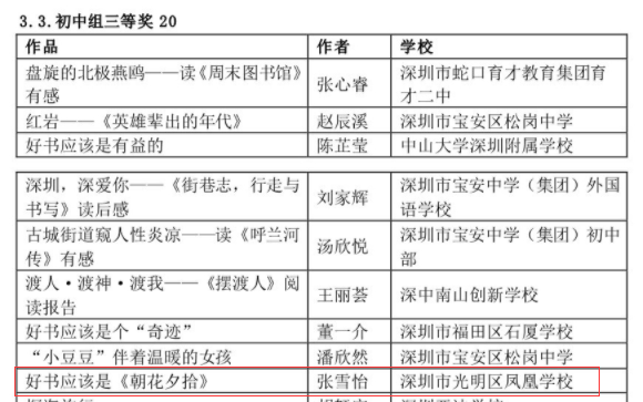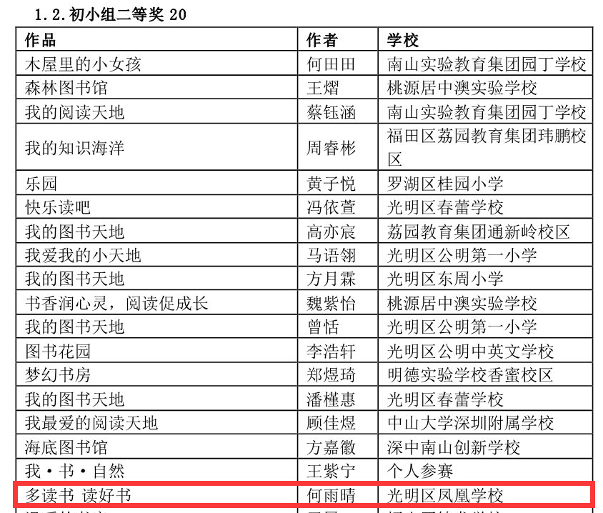 在深圳市4·23世界讀書日“探索閱讀新領域”創(chuàng)作比賽中學校榮獲優(yōu)秀組織獎,何雨晴、劉宥伯同學分別獲初小組二等獎、三等獎;阮澤宇、張雪怡同學分別榮獲初中組二等獎、三等獎。郭瑞芳老師榮獲優(yōu)秀指導老師獎,曾嵽稜、賴美君、李海亮榮獲優(yōu)秀組織老師獎。