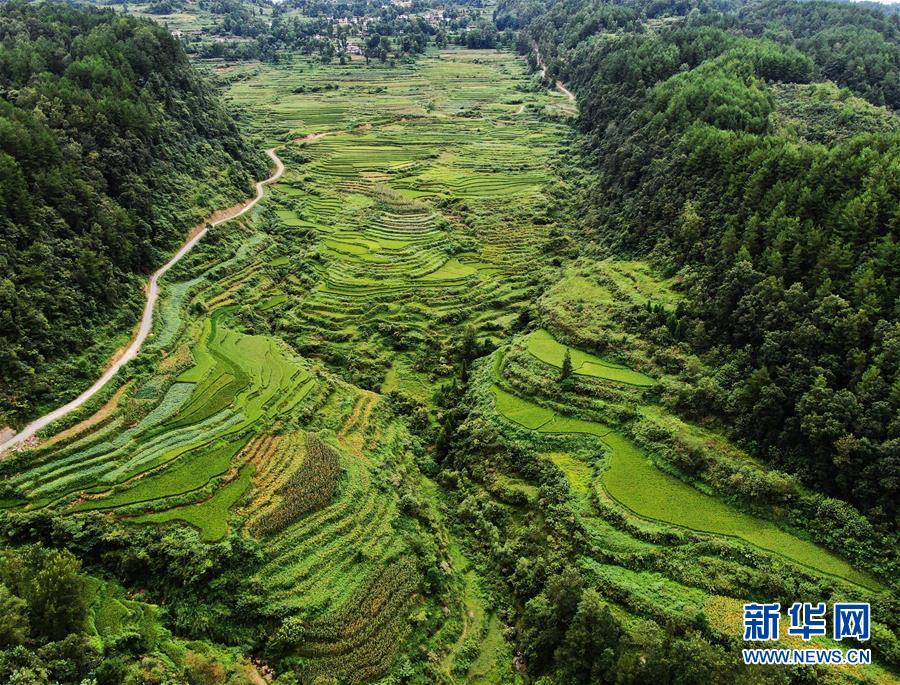 這是8月13日拍攝的鞍子鎮(zhèn)大林村梯田景色(無人機(jī)照片)。時(shí)下,重慶市彭水苗族土家族自治縣鞍子鎮(zhèn)大林村的梯田景色迷人,構(gòu)成一幅幅山鄉(xiāng)田園美景。新華社記者王全超攝