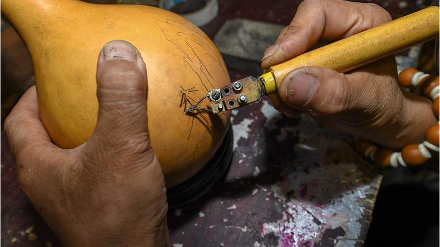 8月5日,侯景偉在葫蘆上進(jìn)行創(chuàng)作。經(jīng)過(guò)多年潛心研究,他將浮雕和烙畫工藝相結(jié)合,通過(guò)拋光、起稿、雕刻、烙燙、套色等十余道工藝,制作展現(xiàn)傳統(tǒng)文化、民俗故事的葫蘆工藝品。