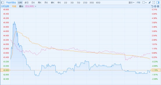 正式納入港股通的平安好醫(yī)生也明顯受到拖累。如果平安好醫(yī)生的分時圖和恒生指數(shù)的分時圖疊加,可以看出,平安好醫(yī)生早段有有迅速沖高的勢頭,但隨后受到大市的影響而轉(zhuǎn)跌,此后走勢與大盤幾乎同步。不過,平安好醫(yī)生走勢相對穩(wěn)健,最終僅跌1.15%,跑贏恒指,報價42.85港元,成交額1777萬港元。