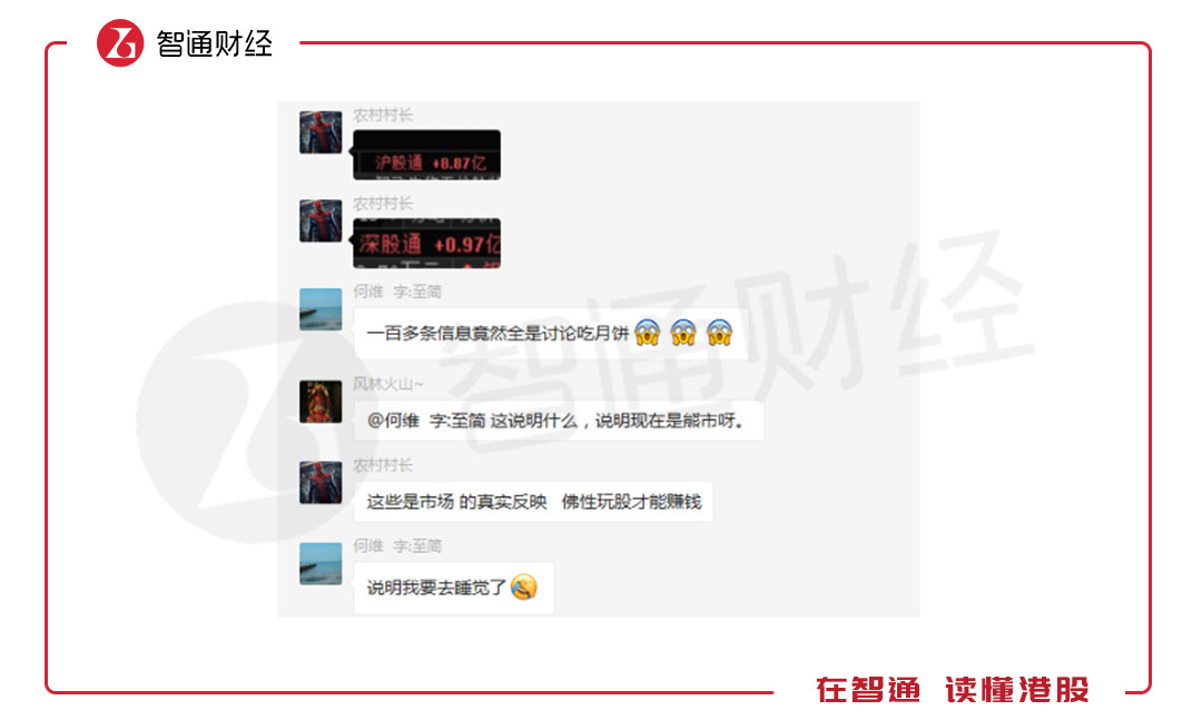 被黑天鵝痛擊一番后,市場(chǎng)悲觀情緒明顯占據(jù)了上風(fēng)。智通財(cái)經(jīng)APP觀察到,某500人的投資大群雖活躍度照常,但全變成了說(shuō)“新財(cái)富風(fēng)月”、“品月餅”,絲毫沒(méi)有往日的“談市場(chǎng)、擺數(shù)據(jù)、說(shuō)動(dòng)向”,甚至不惜爭(zhēng)個(gè)臉紅耳赤的情形。
