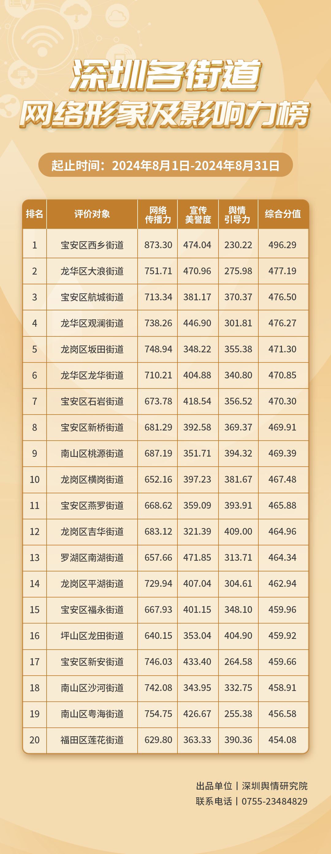 2024年8月,各街道不斷探索治理新路徑,力求效能躍升,《深圳各街道網(wǎng)絡形象及影響力榜》(8月榜單)發(fā)布,為您揭曉哪些街道網(wǎng)絡形象治理實效顯著,成標桿,本期榜單數(shù)據(jù)統(tǒng)計范圍為2024年8月1日至8月31日。