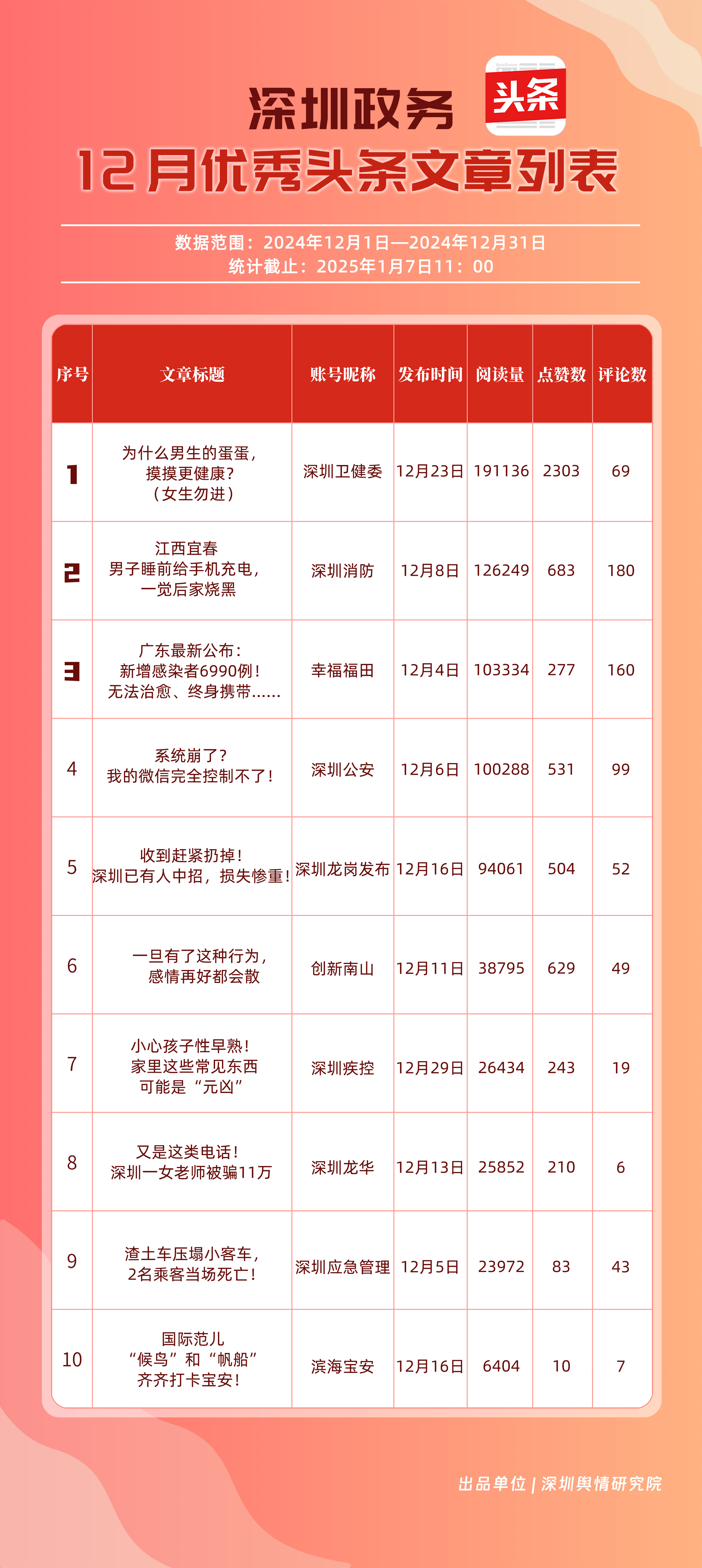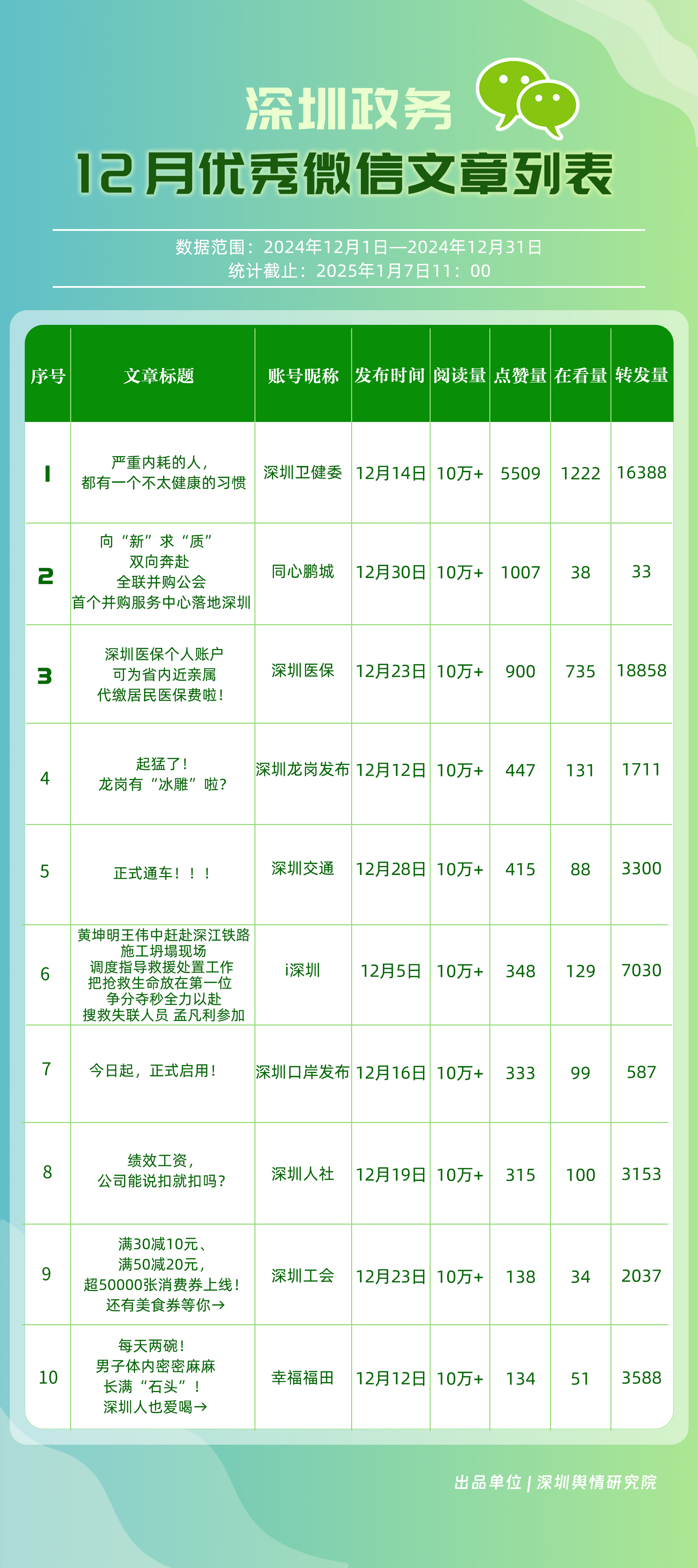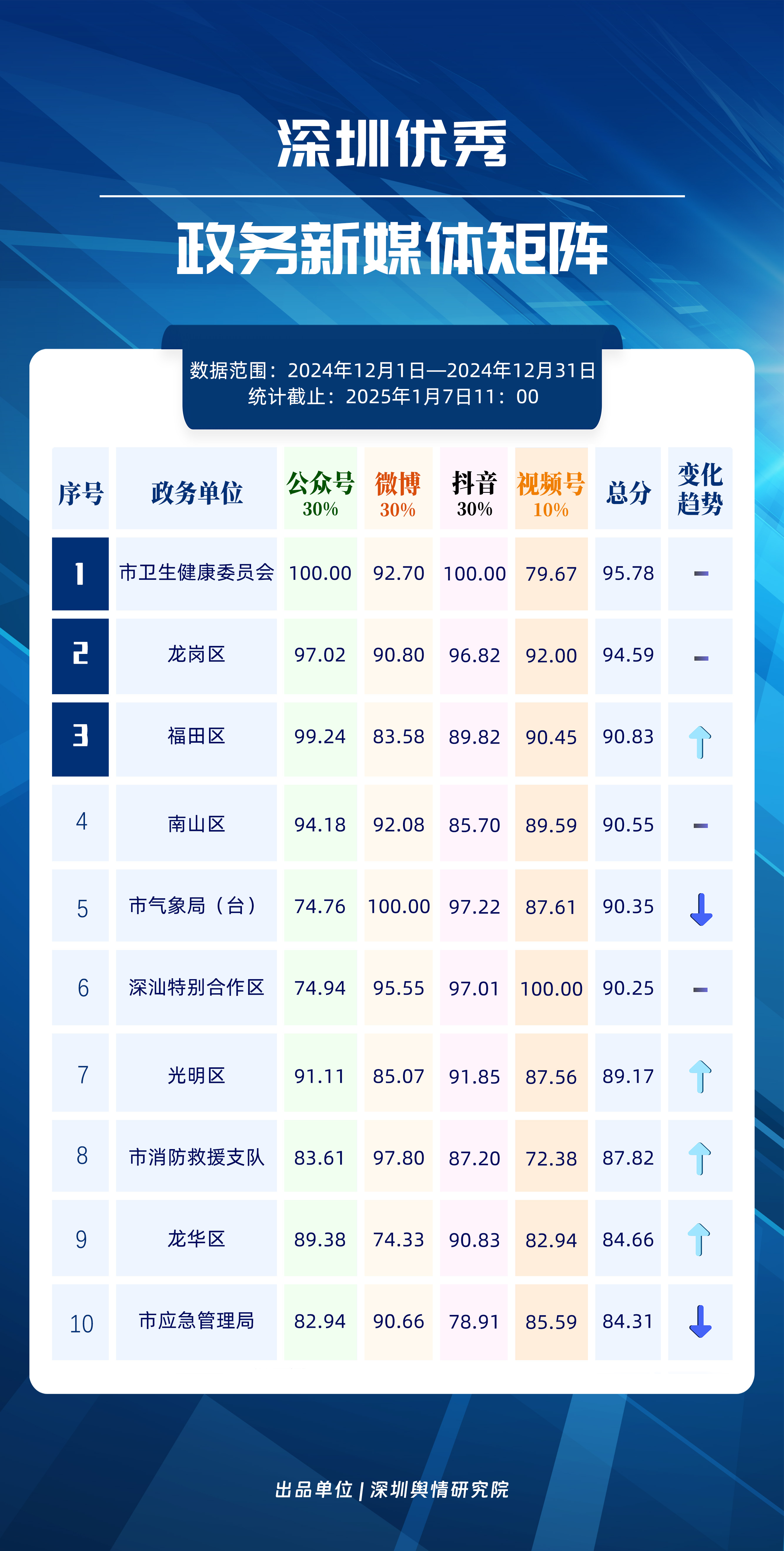 12月,市衛(wèi)生健康委、龍崗區(qū)、福田區(qū)、南山區(qū)、市氣象局、深汕特別合作區(qū)、光明區(qū)、市消防救援支隊(duì)、龍華區(qū)、市應(yīng)急管理局榮登“深圳優(yōu)秀政務(wù)新媒體矩陣”榜單。12月,市衛(wèi)生健康委持續(xù)發(fā)力抖音等平臺(tái),鞏固榜首地位,展現(xiàn)了政務(wù)宣傳賬號(hào)的蓬勃活力與創(chuàng)新能力,贏得了廣泛關(guān)注。龍崗區(qū)新媒體矩陣則在微信公眾號(hào)、抖音兩大平臺(tái)上取得了亮眼成績(jī)。福田區(qū)新媒體矩陣通過(guò)精心策劃與運(yùn)營(yíng)微信公眾號(hào)平臺(tái),成功吸引了大量忠實(shí)讀者,最終在《深圳優(yōu)秀政務(wù)新媒體矩陣》榜單中榮獲第三名。同時(shí),南山區(qū)、市氣象局、深汕特別合作區(qū)等新媒體矩陣在也在各自領(lǐng)域內(nèi)大放異彩,在榜單中名列前茅。