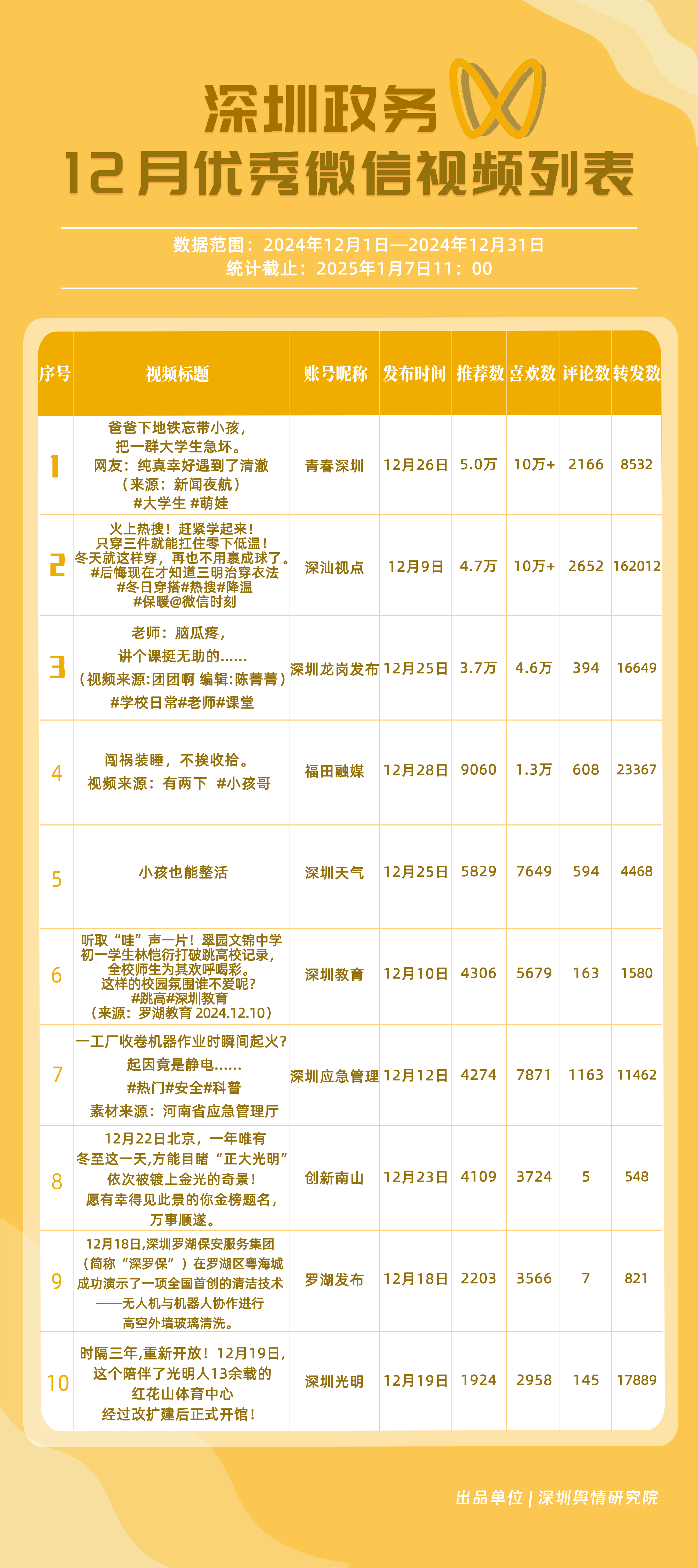 12月,獲“深圳優(yōu)秀政務(wù)微信視頻號(hào)”稱號(hào)的分別是“深汕視點(diǎn)”“青春深圳”“深圳龍崗發(fā)布”“福田融媒”“創(chuàng)新南山”“深圳天氣”“深圳光明”“深圳工會(huì)”“深圳應(yīng)急管理”“深圳教育”。其中,“深汕視點(diǎn)”“青春深圳”在互動(dòng)方面表現(xiàn)突出,占據(jù)榜單第一、第二位置。“深圳龍崗發(fā)布”活躍、互動(dòng)指數(shù)位于各政務(wù)視頻號(hào)前列,排名有所提升?!案L锶诿健比笾笜?biāo)得分均在90分以上,位于榜單第四名,充分展現(xiàn)各政務(wù)微信視頻號(hào)在信息更新、用戶互動(dòng)以及傳播范圍等方面的卓越能力和持續(xù)進(jìn)步。