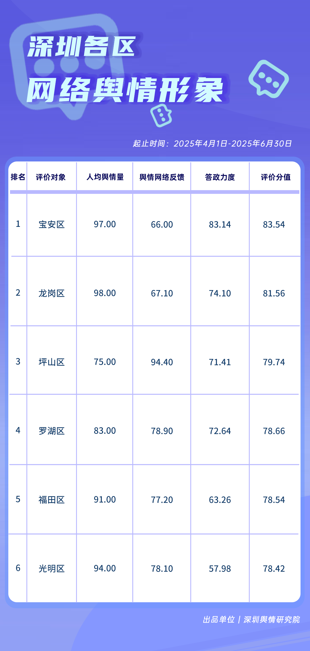4-6月,在網(wǎng)絡(luò)輿情方面,寶安區(qū)、龍崗區(qū)憑借較低的人均輿情量、較好的答政效果,位居榜單前二;坪山區(qū)、羅湖區(qū)、福田區(qū)、光明區(qū)也躋身前列,以優(yōu)異分?jǐn)?shù)展現(xiàn)其在網(wǎng)絡(luò)輿情工作中的積極成效,彰顯了各區(qū)在營(yíng)造良好網(wǎng)絡(luò)輿情環(huán)境、及時(shí)回應(yīng)網(wǎng)民訴求上的主動(dòng)擔(dān)當(dāng)。
