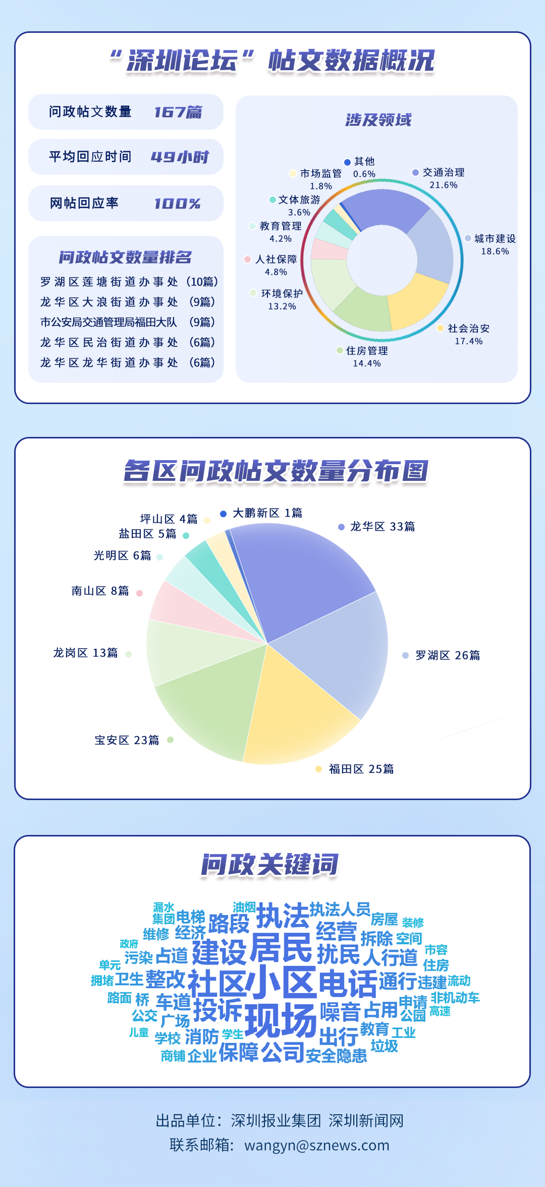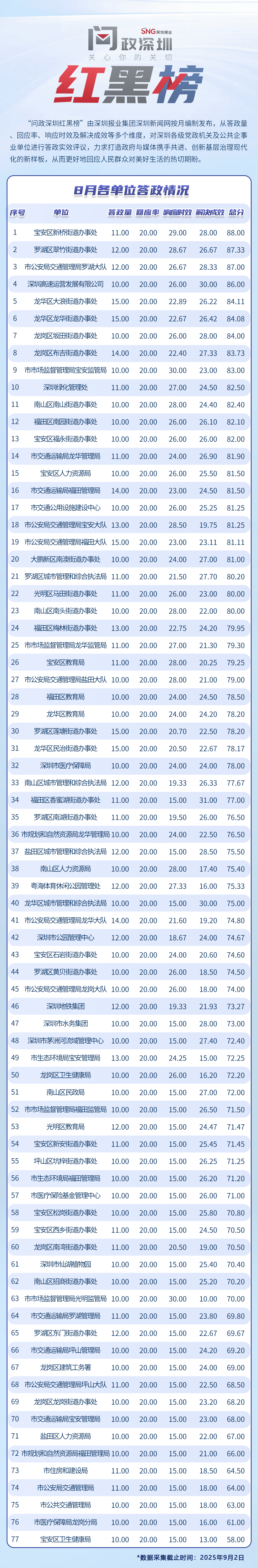 為探尋媒體如何精準(zhǔn)賦能基層治理現(xiàn)代化的“深圳路徑”,深圳報(bào)業(yè)集團(tuán)正式掛牌成立“問政深圳”工作室,旨在進(jìn)一步推動(dòng)網(wǎng)絡(luò)問政工作的高效開展。為確保相關(guān)工作更加契合實(shí)際需求,自上期起,深圳報(bào)業(yè)集團(tuán)深圳新聞網(wǎng)按照“最快速度辦結(jié)”的總體要求,將原有月度榜單創(chuàng)新升級(jí)為“問政深圳紅黑榜”,并對(duì)評(píng)分體系進(jìn)行了細(xì)致優(yōu)化。該榜單從答政量、回應(yīng)率、響應(yīng)時(shí)效及解決成效等多個(gè)維度,對(duì)深圳各級(jí)黨政機(jī)關(guān)及公共企事業(yè)單位進(jìn)行答政實(shí)效評(píng)議,力求打造政府與媒體攜手共進(jìn)、創(chuàng)新基層治理現(xiàn)代化的新樣板,從而更好地回應(yīng)人民群眾對(duì)美好生活的熱切期盼。