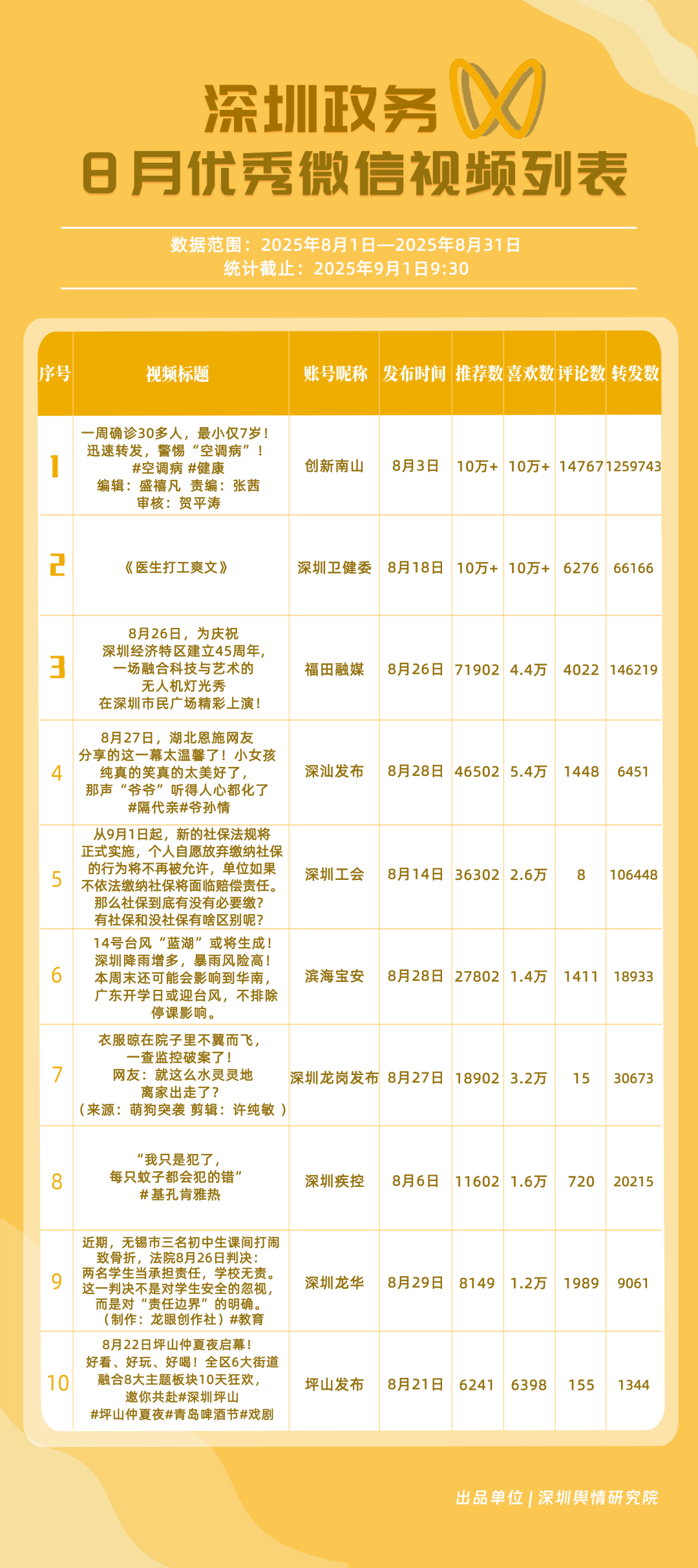 8月,“深圳衛(wèi)健委”“深汕發(fā)布”“深圳魅力福田”“深圳天氣”“掌上龍崗”“DOU愛龍華”“創(chuàng)新南山”“深圳普法”“文旅深圳”“美好鹽田”共10個政務抖音號獲得“優(yōu)秀政務抖音號”稱號?!吧钲谛l(wèi)健委”內容吸引大量網民關注,4條視頻累計獲得超50萬次點贊,排名從上期的第九名上升至第一名;“深汕發(fā)布”憑借較高的傳播指數評分,位列第二名,排名有所上升。“深圳魅力福田”“深圳天氣”等賬號緊隨其后,得分均在95分左右。上榜的優(yōu)秀政務抖音號深耕優(yōu)質創(chuàng)作,精準把握網民興趣點,使作品收獲高點贊、高轉發(fā),推動評論區(qū)形成良性互動氛圍,以優(yōu)秀內容提升政務傳播效能。