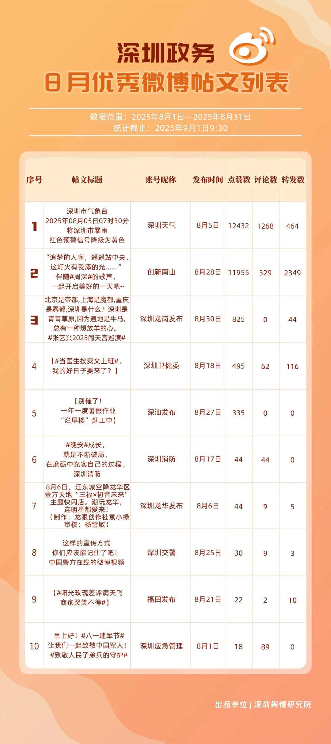 8月,“深圳幸福福田”“深圳消防”“深圳衛(wèi)健委”“創(chuàng)新南山”“深圳人社”“羅湖發(fā)布”“深圳龍崗發(fā)布”“深圳龍華”“青春深圳”“坪山發(fā)布”共10個政務頭條號入選“優(yōu)秀政務頭條號”榜單。“深圳幸福福田”憑借持續(xù)優(yōu)異的綜合表現,以滿分成績穩(wěn)居榜單首位,彰顯出強大的政務傳播力與影響力;“深圳消防”“深圳衛(wèi)健委”則以穩(wěn)定的內容質量與深厚的民眾基礎,持續(xù)為市民提供權威、及時的服務信息,排名穩(wěn)固?!皠?chuàng)新南山”“深圳人社”等上榜賬號亦表現亮眼,聚焦民生服務傳遞政策溫度,共同構成政務新媒體矩陣的中堅力量,為城市治理與民生服務注入鮮活動能。