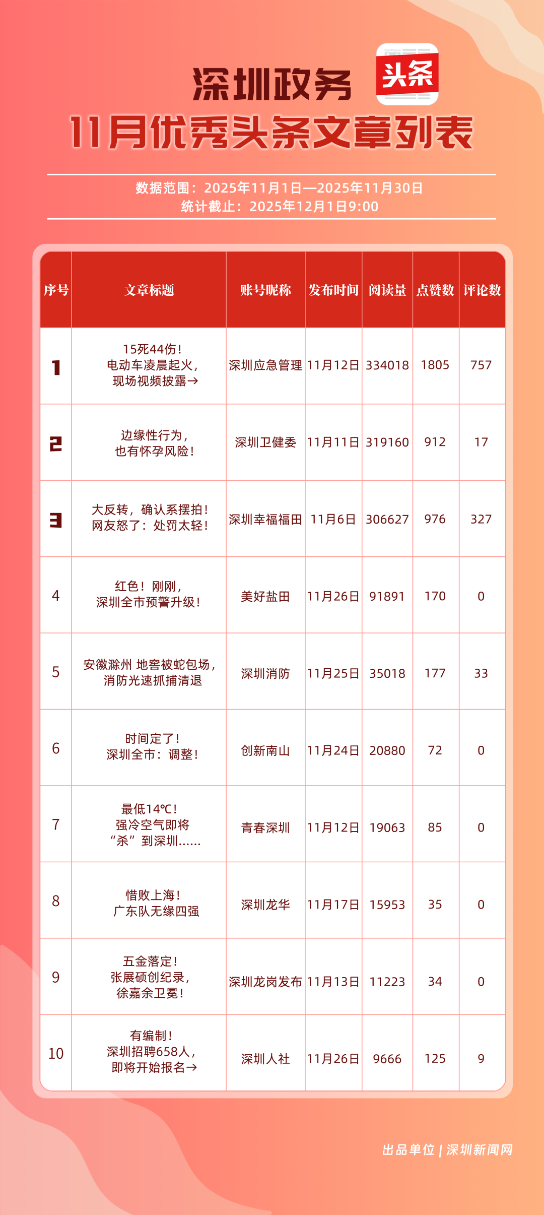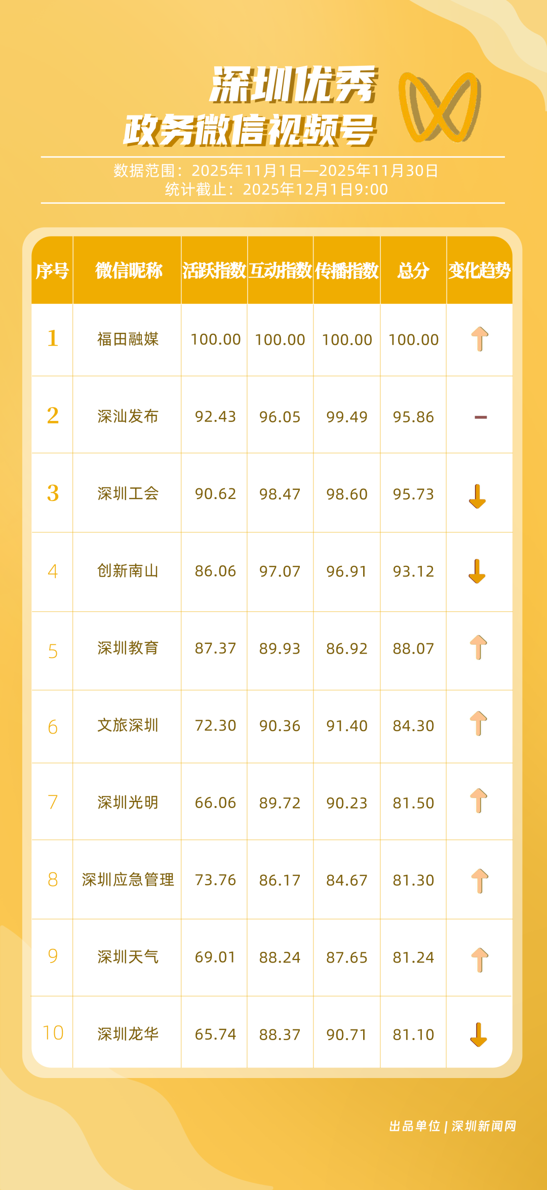 2025年11月期《深圳優(yōu)秀政務新媒體矩陣》正式發(fā)布,本期上榜矩陣持續(xù)提升傳播效能,通過各類創(chuàng)新實踐在政務傳播賽道強勢突圍,用“民生關切+區(qū)域特色”的內(nèi)容創(chuàng)作,攜手構(gòu)建起深圳政務傳播的新圖景,為政務新媒體的高質(zhì)量發(fā)展增添新能量。