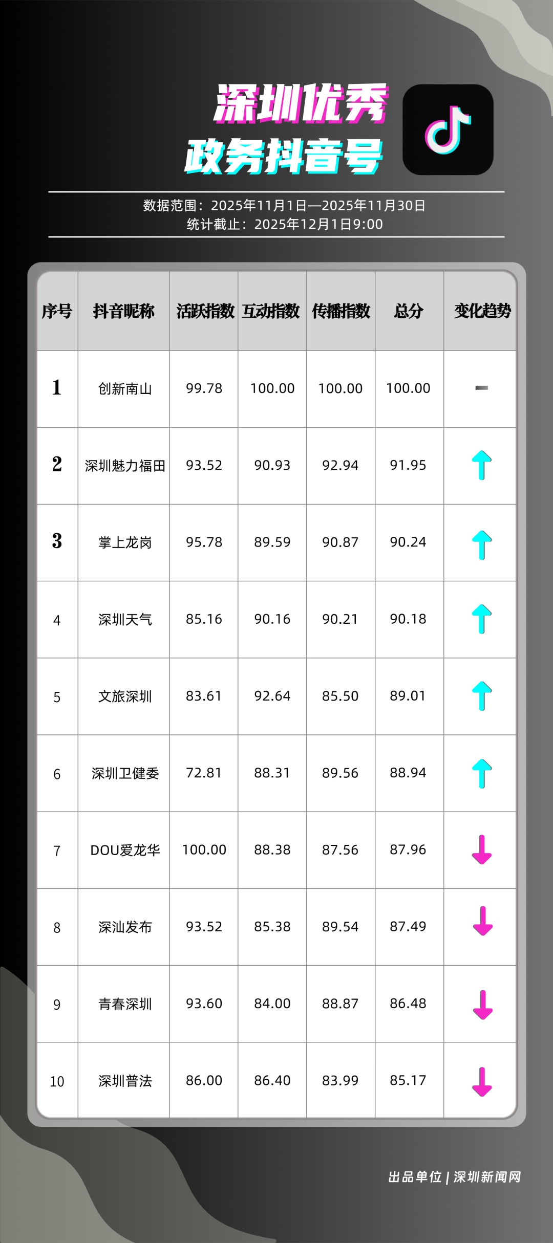 11月,獲得“優(yōu)秀政務抖音號”稱號的是“創(chuàng)新南山”“深圳魅力福田”“掌上龍崗”“深圳天氣”“文旅深圳”“深圳衛(wèi)健委”“DOU愛龍華”“深汕發(fā)布”“青春深圳”“深圳普法”?!皠?chuàng)新南山”多篇文旅、健康及出行相關內(nèi)容分享超10萬次,在互動、傳播方面表現(xiàn)亮眼,蟬聯(lián)榜首;“深圳魅力福田”在各方面指數(shù)評分較為均衡,位列第二名;“掌上龍崗”在活躍指數(shù)得分較高,能夠較好均衡內(nèi)容數(shù)量與質(zhì)量,位居第三,排名較上期有所提高?!吧钲谔鞖狻薄拔穆蒙钲凇钡荣~號緊隨其后,得分均在90分上下。上榜優(yōu)秀政務抖音號通過深耕內(nèi)容創(chuàng)作,收獲了高點贊、高分享的傳播效果,也推動評論區(qū)形成正向互動生態(tài),最終以優(yōu)質(zhì)內(nèi)容為核心載體,增強政務賬號影響力。