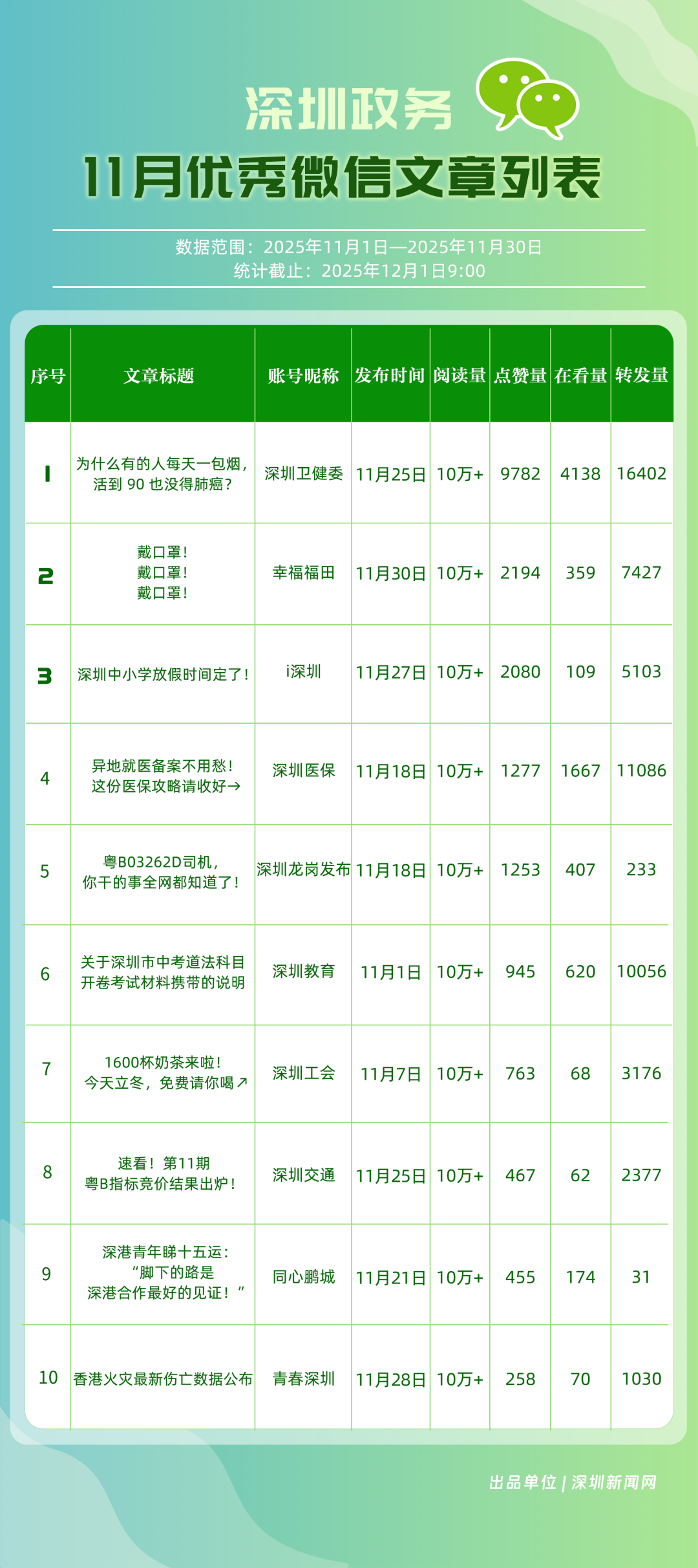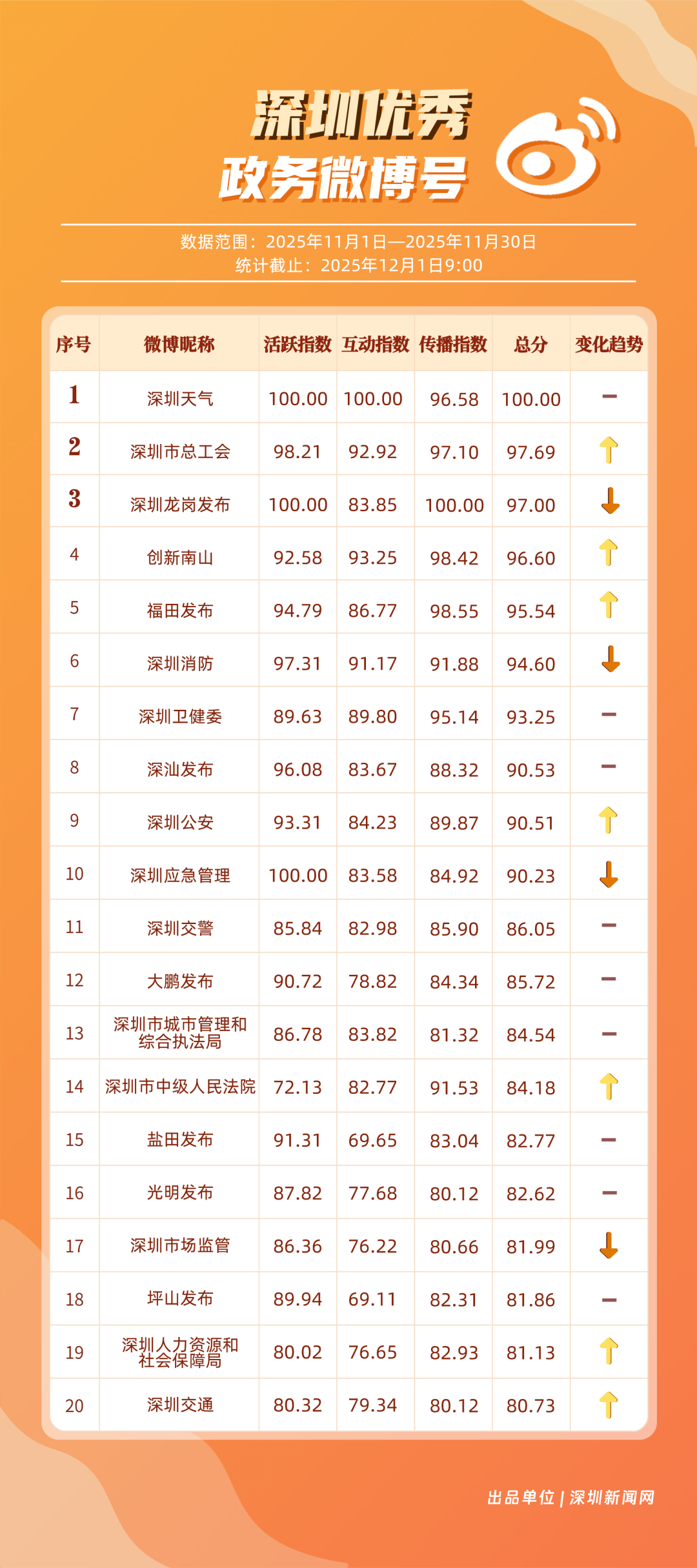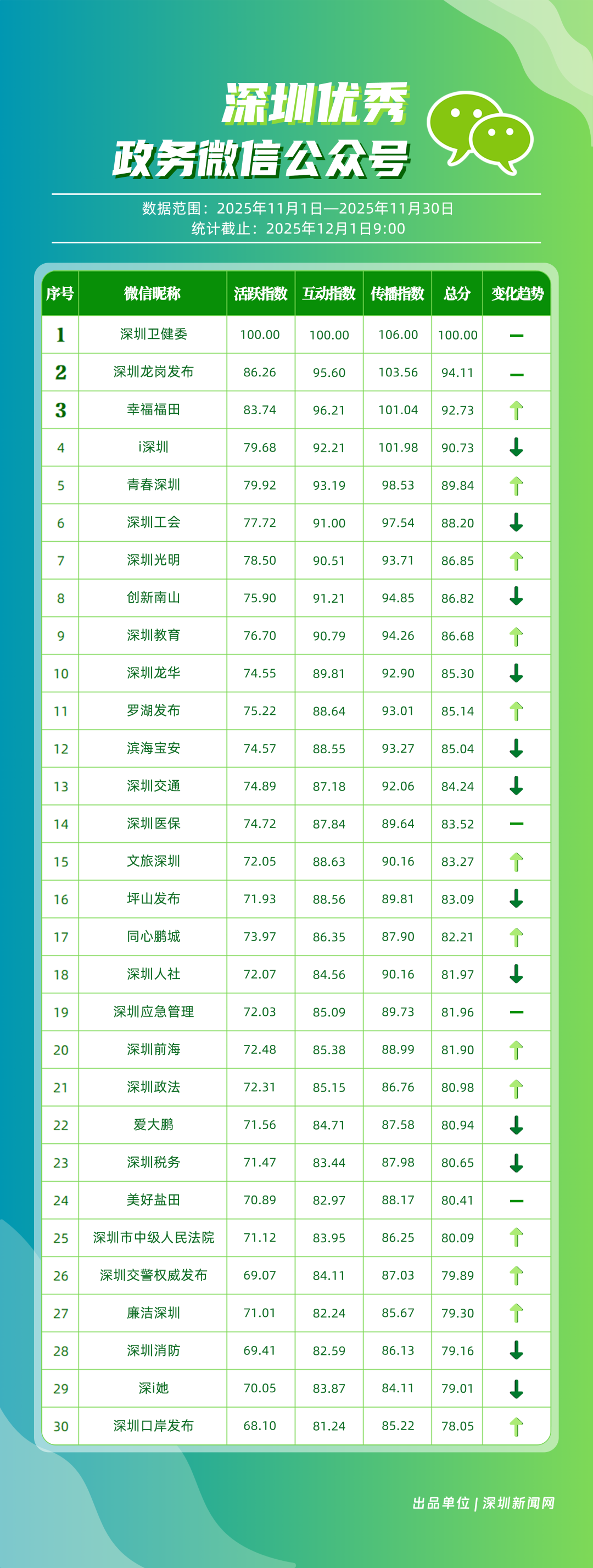 11月,“深圳衛(wèi)健委”“深圳龍崗發(fā)布”“幸福福田”“i深圳”“青春深圳”“深圳工會”“深圳光明”“創(chuàng)新南山”“深圳教育”“深圳龍華”等30個政務微信公眾號榮登“深圳優(yōu)秀政務微信公眾號”榜單。11月,“深圳衛(wèi)健委”在活躍、互動、傳播方面均取得較好成效,以滿分位于榜單首位;“深圳龍崗發(fā)布”在傳播、互動指數(shù)得分較高,十余篇文章閱讀量超10萬次,位居榜單第二;“幸福福田”持續(xù)發(fā)布優(yōu)秀內(nèi)容,排名第三?!癷深圳”“青春深圳”“深圳工會”等政務賬號在信息發(fā)布中拓展信息維度、深化服務場景,評分在88分以上。上榜微信公眾號以高質(zhì)量內(nèi)容為核心抓手,在政務傳播賽道樹立了標桿形象,成為兼具影響力與公信力的典范。