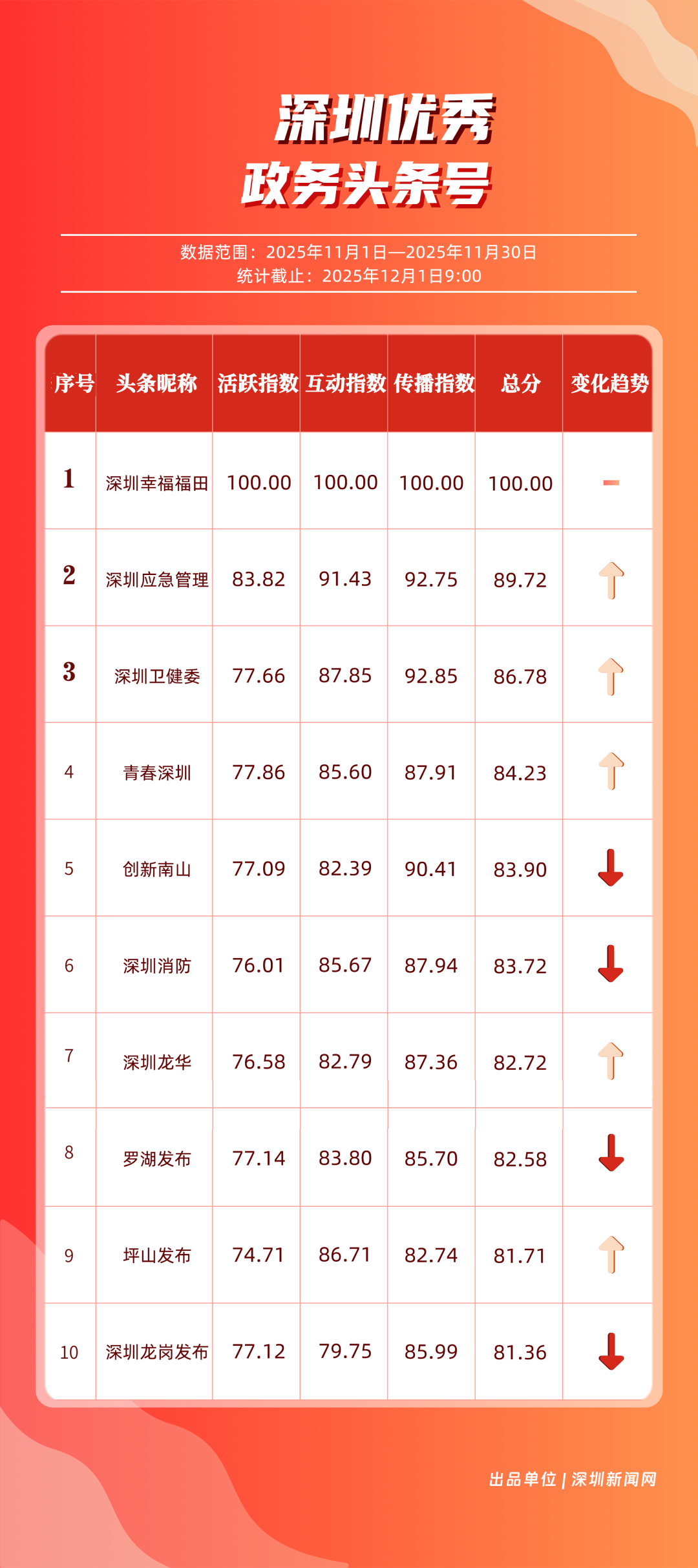 11月,“深圳幸福福田”“深圳應急管理”“深圳衛(wèi)健委”“青春深圳”“創(chuàng)新南山”“深圳消防”“深圳龍華”“羅湖發(fā)布”“坪山發(fā)布”“深圳龍崗發(fā)布”共10個政務頭條號入選“優(yōu)秀政務頭條號”榜單。“深圳幸福福田”發(fā)揮穩(wěn)定,以滿分成績蟬聯(lián)榜首,彰顯出強大的政務傳播力與影響力;“深圳應急管理”積極發(fā)布應急、安全類內(nèi)容,位居第二;“深圳衛(wèi)健委”則以優(yōu)質(zhì)健康類信息吸引市民關注,排名上升至第3位?!扒啻荷钲凇薄皠?chuàng)新南山”“深圳消防”得分在83分以上。相關上榜賬號以內(nèi)容創(chuàng)新為紐帶,聚焦民生,為城市治理現(xiàn)代化與民生服務精細化注入了鮮活力量。