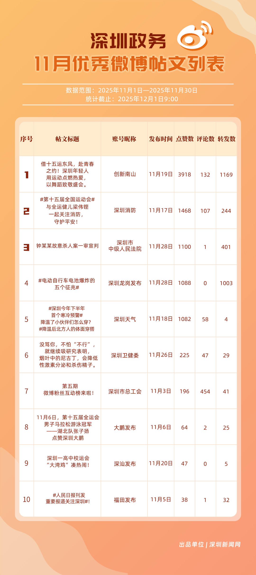 11月,20個賬號入選“優(yōu)秀政務微博號”榜單,其中包括:“深圳天氣”“深圳市總工會”“深圳龍崗發(fā)布”“創(chuàng)新南山”“福田發(fā)布”“深圳消防”“深圳衛(wèi)健委”“深汕發(fā)布”“深圳公安”“深圳應急管理”等。其中,“深圳天氣”高頻次發(fā)布天氣類信息,受到網(wǎng)民肯定,蟬聯(lián)榜首;“深圳市總工會”發(fā)布互動抽獎、十五運等多元內(nèi)容,排名提升至第二;“深圳龍崗發(fā)布”在傳播指數(shù)獲得較高得分,助力其位列第三。上榜優(yōu)秀政務微博賬號以優(yōu)秀內(nèi)容提升賬號競爭力,贏得公眾認可,實現(xiàn)了政務信息的有效傳播,為政務新媒體的內(nèi)容運營與價值傳遞提供參考。