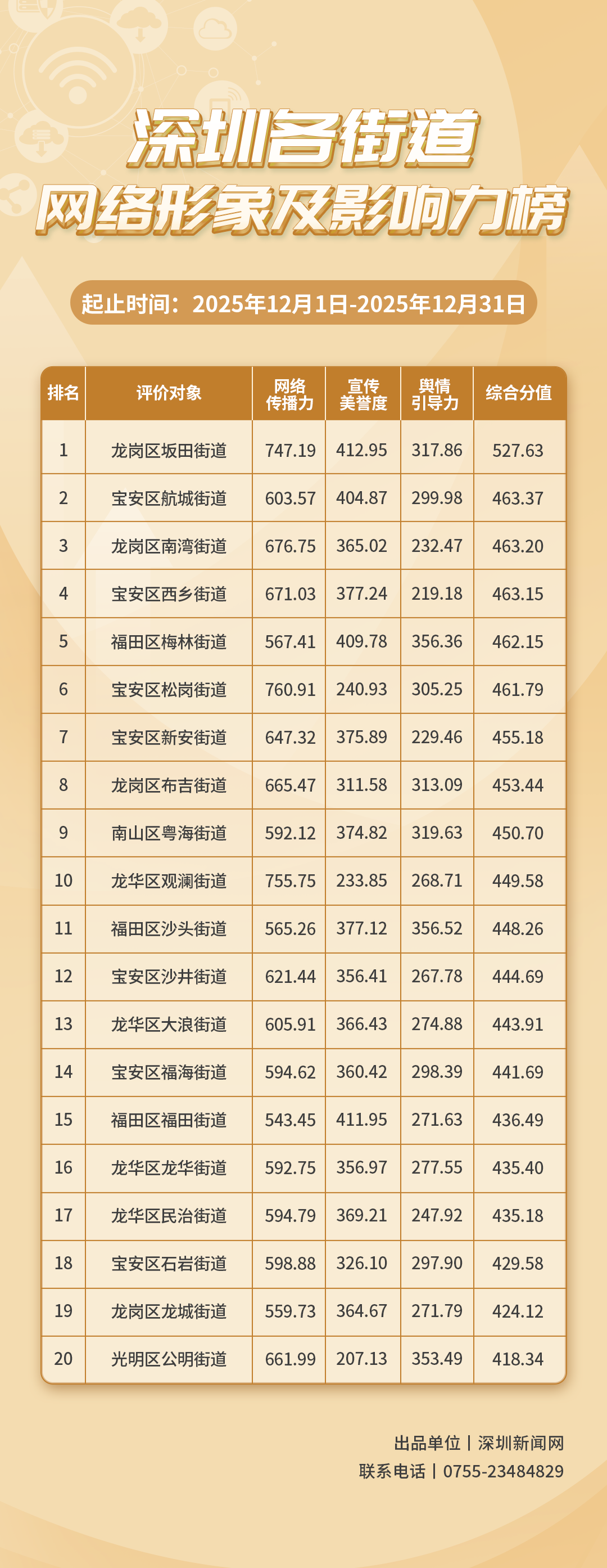 12月,各街道主動(dòng)把握網(wǎng)絡(luò)傳播邏輯,持續(xù)優(yōu)化治理路徑、拓展服務(wù)場(chǎng)景,以網(wǎng)絡(luò)搭建起政民互動(dòng)的“連心路”?!渡钲诟鹘值谰W(wǎng)絡(luò)形象及影響力榜》(12月榜單)已編制完成,對(duì)各街道在網(wǎng)絡(luò)空間的展現(xiàn)及其影響力進(jìn)行了全面的觀察與評(píng)估。本次榜單的數(shù)據(jù)統(tǒng)計(jì)時(shí)間跨度為2025年12月1日至12月31日。