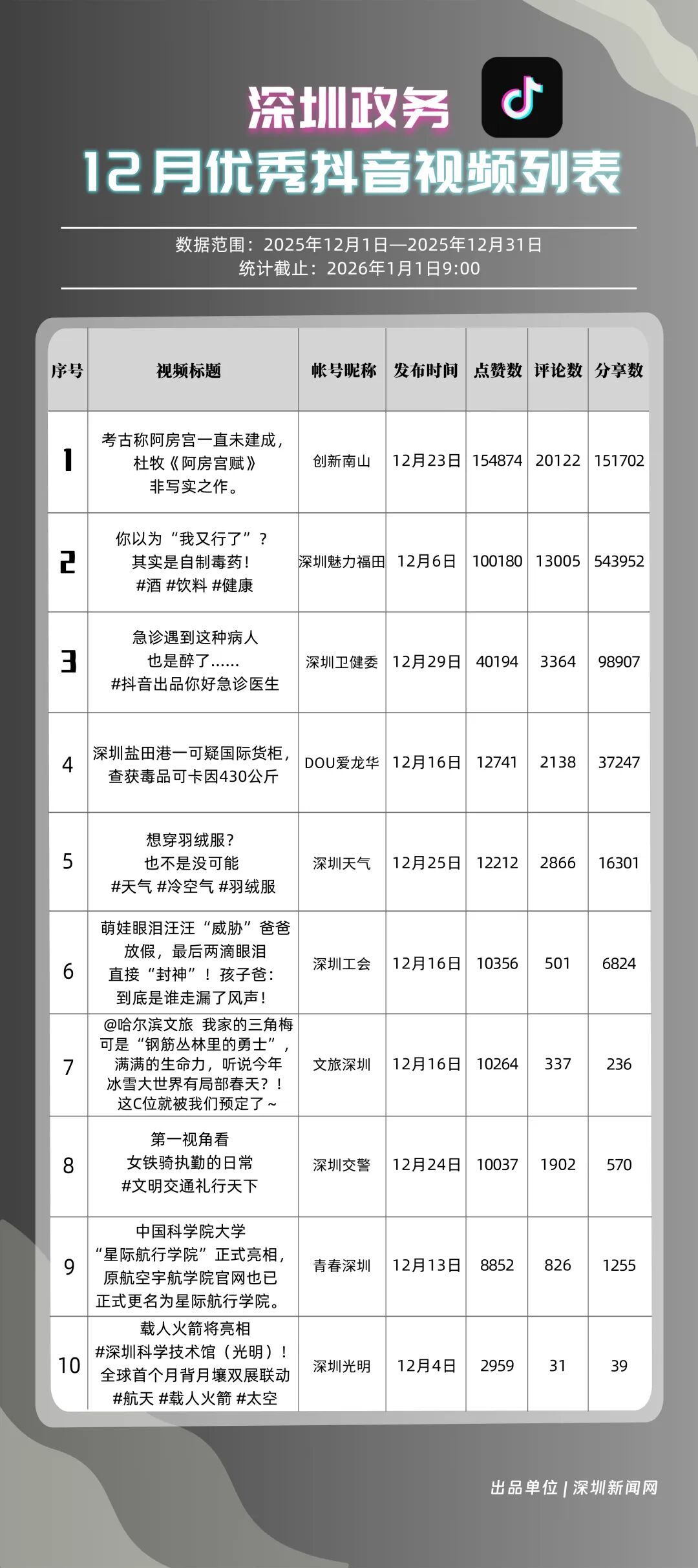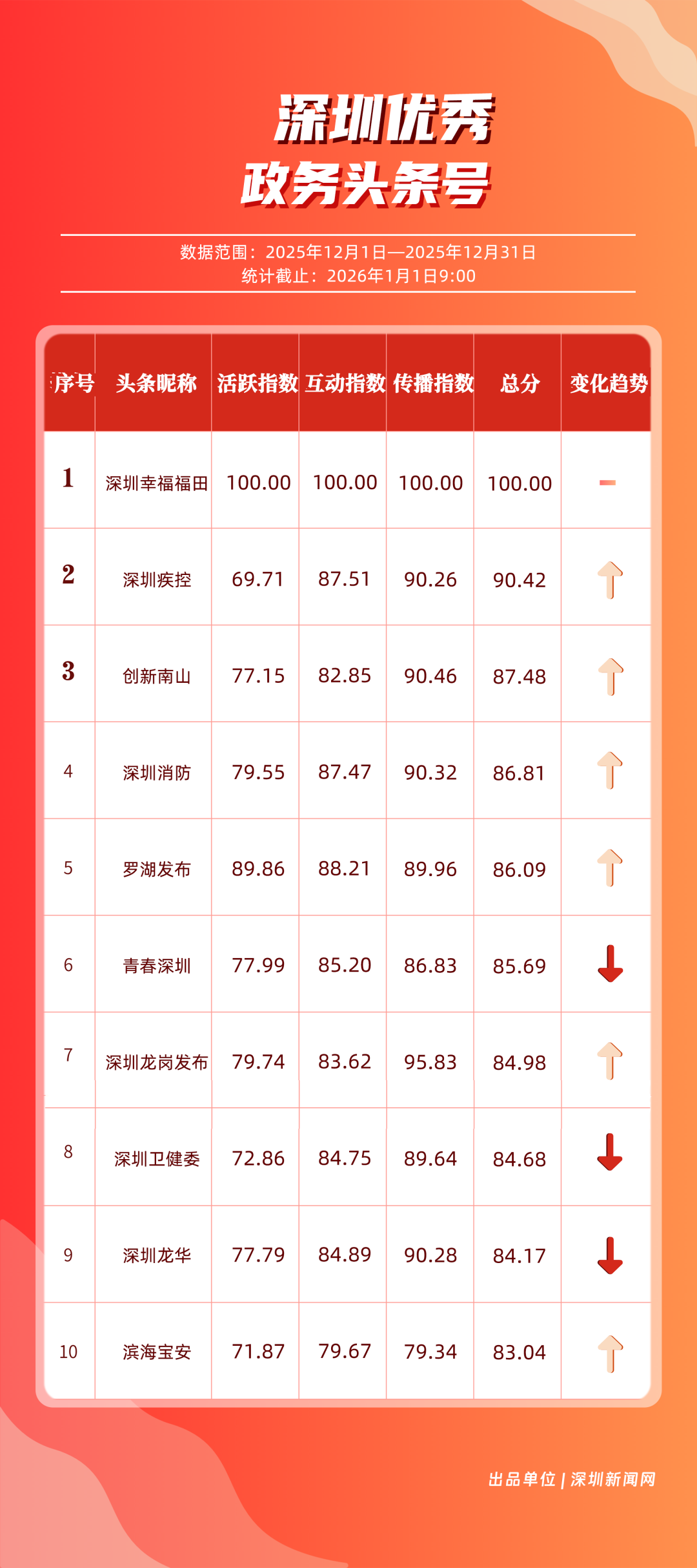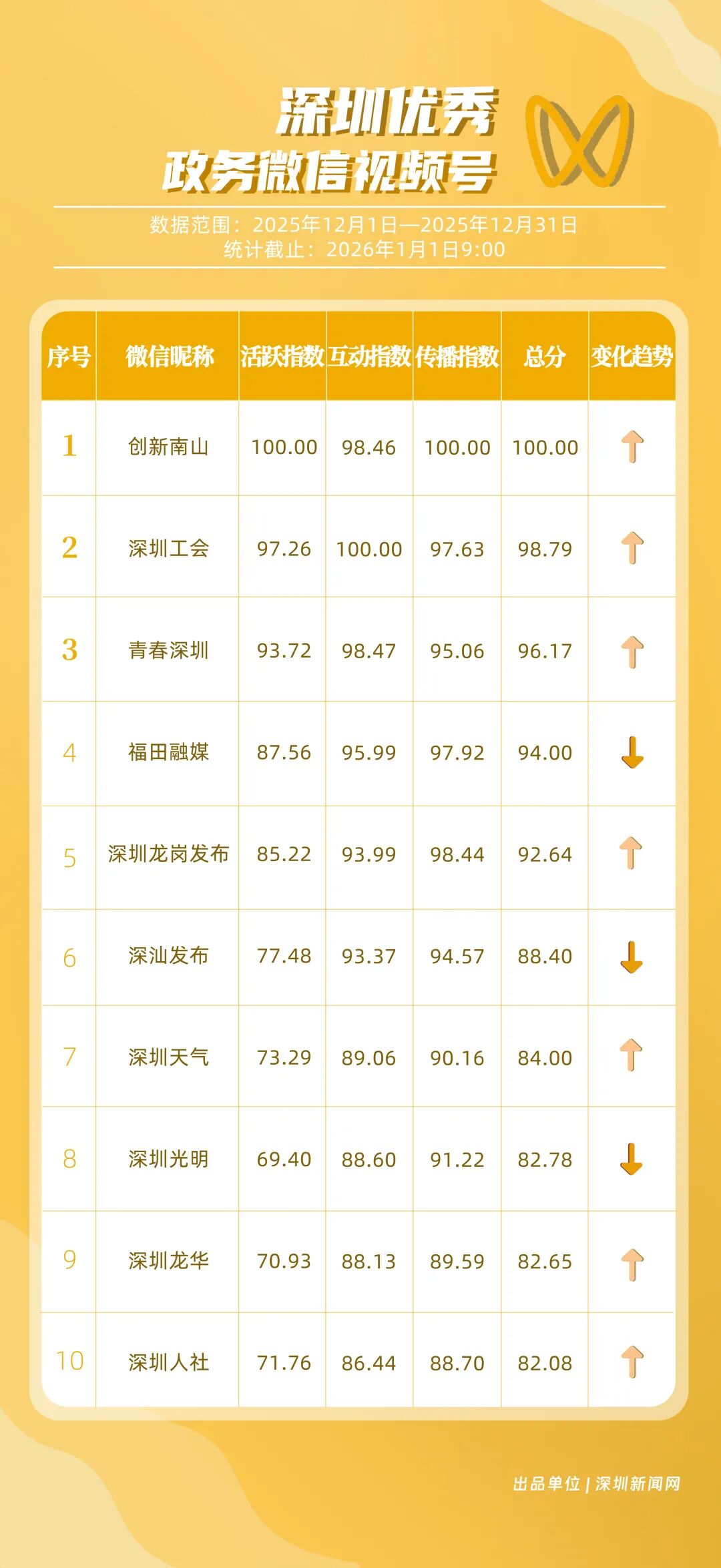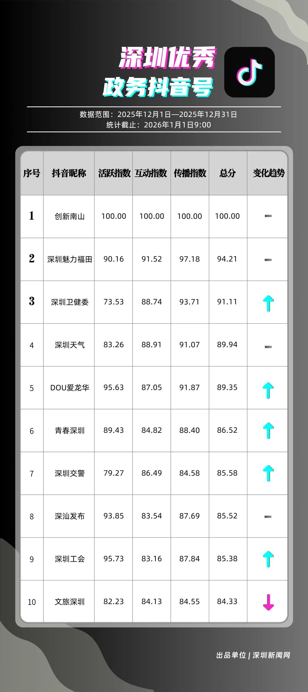 12月,深圳政務(wù)新媒體矩陣持續(xù)深耕內(nèi)容生態(tài),各單位依托平臺特色深化服務(wù)效能,南山區(qū)、福田區(qū)、市衛(wèi)生健康委員會、市總工會、龍崗區(qū)、市氣象局(臺)、光明區(qū)、中國共產(chǎn)主義青年團深圳市委員會、龍華區(qū)、深汕特別合作區(qū)的新媒體矩陣入選“深圳優(yōu)秀政務(wù)新媒體矩陣”榜單。12月,南山區(qū)新媒體矩陣中,“創(chuàng)新南山”賬號在抖音平臺保持高質(zhì)量創(chuàng)作態(tài)勢,單賬號單月視頻總點贊量突破120萬,視頻號平臺同樣表現(xiàn)亮眼,單月視頻總轉(zhuǎn)發(fā)量超70萬,憑借雙平臺滿分的傳播表現(xiàn),位居榜單首位;福田區(qū)新媒體矩陣表現(xiàn)均衡穩(wěn)定,在各平臺得分均在92分以上,以93.94分的總成績位列第二;市衛(wèi)生健康委員會新媒體矩陣在微信公眾號持續(xù)輸出專業(yè)優(yōu)質(zhì)內(nèi)容,在該平臺獲得滿分,助力其以92.21分的總分排名第三位。此外,市總工會、龍崗區(qū)新媒體矩陣總分均超90分,以“各美其美”的發(fā)展態(tài)勢,展現(xiàn)深圳政務(wù)新媒體矩陣的蓬勃生機。