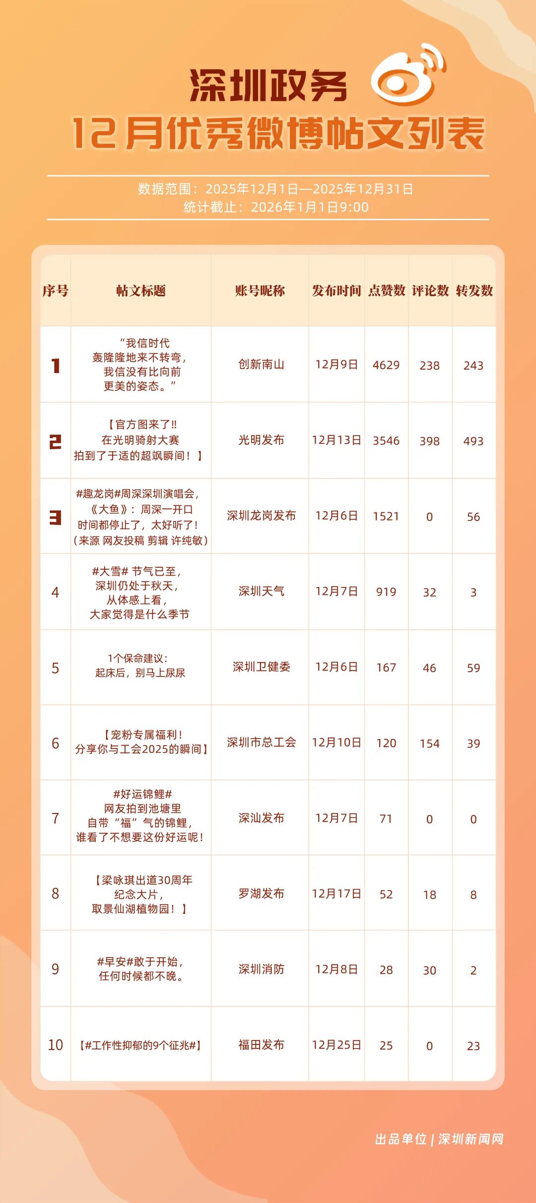 12月,20個賬號入選“優(yōu)秀政務(wù)微博號”榜單,其中包括:“深圳天氣”“深圳市總工會”“創(chuàng)新南山”“福田發(fā)布”“深圳消防”“深圳龍崗發(fā)布”“光明發(fā)布”“深圳衛(wèi)健委”“深圳應(yīng)急管理”“深汕發(fā)布”等。其中,“深圳天氣”精準化發(fā)布天氣信息,高頻次與網(wǎng)民互動,以滿分成績蟬聯(lián)榜首,彰顯其在民生服務(wù)領(lǐng)域的核心價值;“深圳市總工會”積極發(fā)布互動、福利類內(nèi)容,獲得較高用戶參與度與賬號影響力,居于榜單第二;“創(chuàng)新南山”傳播指數(shù)得分超99分,躋身榜單第三。“福田發(fā)布”“深圳消防”等賬號聚焦民生熱點、強化互動運營,居于榜單前列,且排名有所提升。12月上榜政務(wù)微博賬號持續(xù)發(fā)力,實現(xiàn)了政務(wù)信息的有效傳播,為政務(wù)新媒體的內(nèi)容運營與價值傳遞提供了可借鑒的實踐樣本。