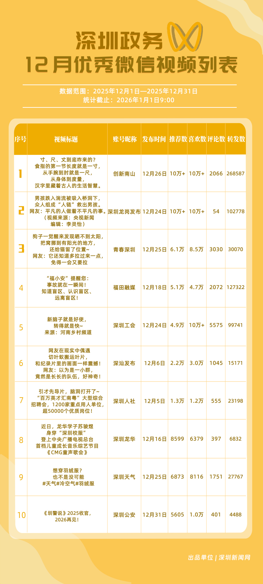 12月,“創(chuàng)新南山”“深圳工會”“青春深圳”“福田融媒”“深圳龍崗發(fā)布”“深汕發(fā)布”“深圳天氣”“深圳光明”“深圳龍華”“深圳人社”榮獲“優(yōu)秀政務(wù)微信視頻號”稱號。“創(chuàng)新南山”活躍指數(shù)、傳播指數(shù)均獲滿分,月作品總轉(zhuǎn)發(fā)量超70萬,領(lǐng)跑榜單;“深圳工會”積極發(fā)布熱點、民生類內(nèi)容,精準對接市民需求,排名上升至第二名;“青春深圳”互動指數(shù)超98分,以高互動量位列榜單第三名。“福田融媒”“深圳龍崗發(fā)布”兩賬號立足區(qū)域特色深耕內(nèi)容,得分超90分。上榜微信視頻號以輕量化短視頻為載體,傳播公眾喜聞樂見的政務(wù)、民生內(nèi)容,打造出兼具傳播力與親和力的政務(wù)宣傳新名片。