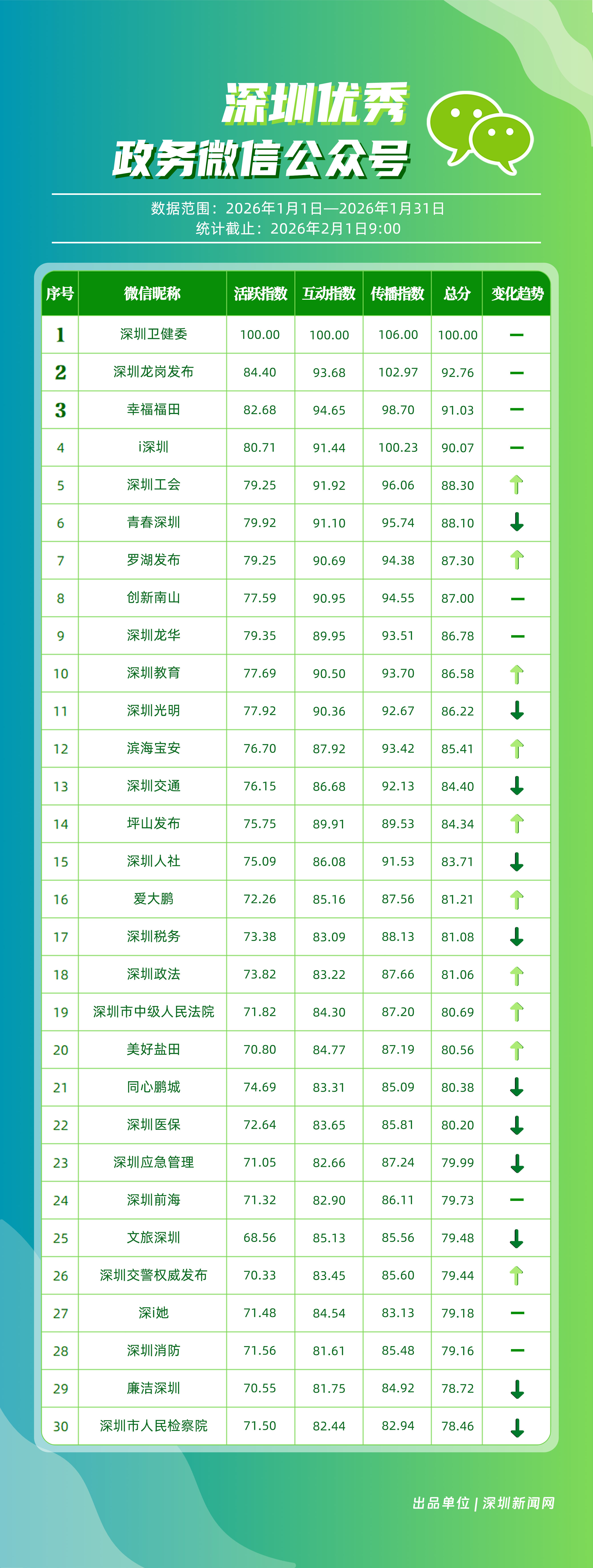 2026年1月,“深圳衛(wèi)健委”“深圳龍崗發(fā)布”“幸福福田”“i深圳”“深圳工會”“青春深圳”“羅湖發(fā)布”“創(chuàng)新南山”“深圳龍華”“深圳教育”等30個政務微信公眾號榮登“深圳優(yōu)秀政務微信公眾號”榜單。1月,頭部賬號“深圳衛(wèi)健委”繼續(xù)保持領先優(yōu)勢,1月份有59篇文章閱讀量突破10萬次,總分100分,穩(wěn)居榜首;“深圳龍崗發(fā)布”在互動與傳播方面表現依然出色,總分102.97分,位列第二;“幸福福田”憑借均衡、穩(wěn)健的運營,在互動與傳播方面表現優(yōu)異,總分91.03分,排名第三。同時,“深圳工會”與“羅湖發(fā)布”等賬號排名相較2025年12月有所提升。上榜微信公眾號持續(xù)深耕內容與服務,不斷拓展發(fā)布維度與深化應用場景,在提升政務信息傳播效能、精準對接民生需求方面,發(fā)揮了關鍵作用。