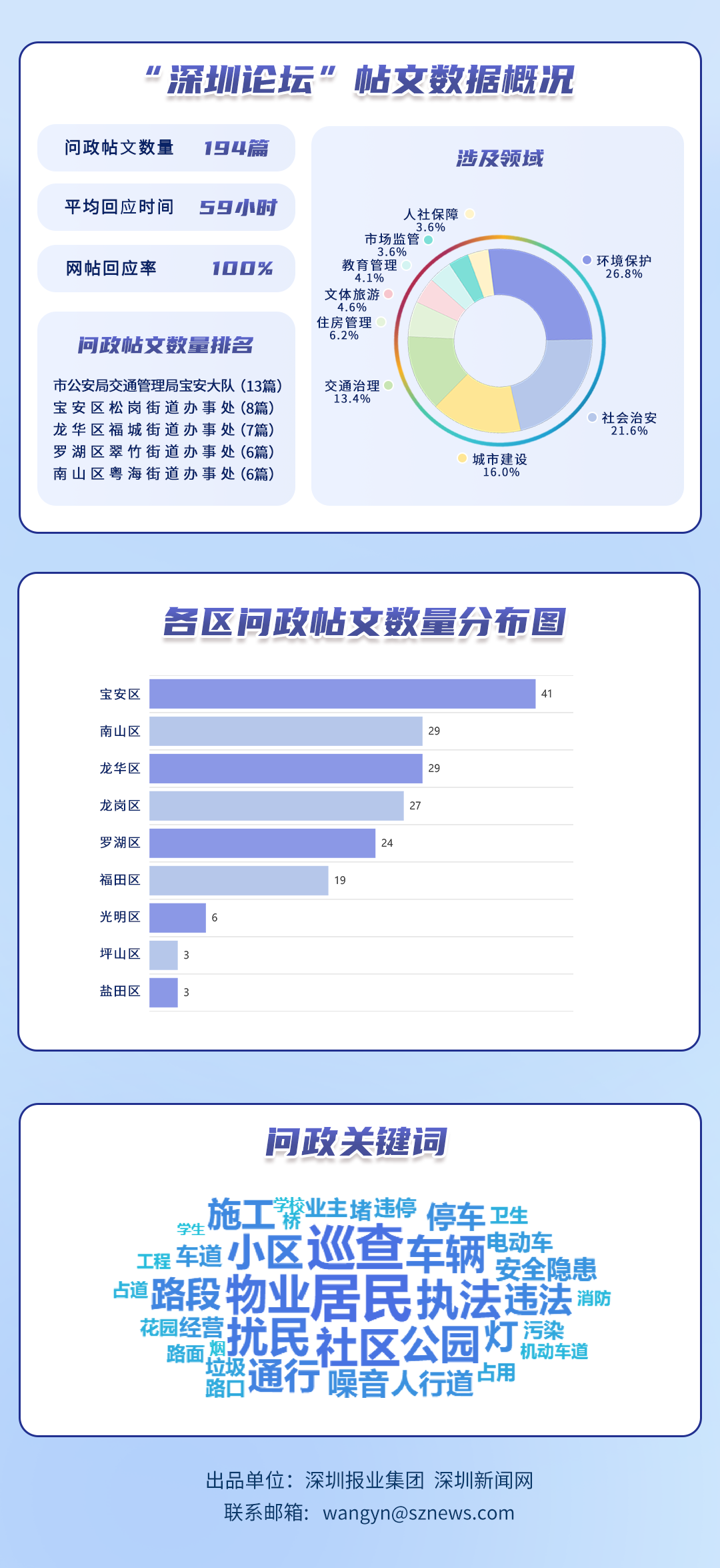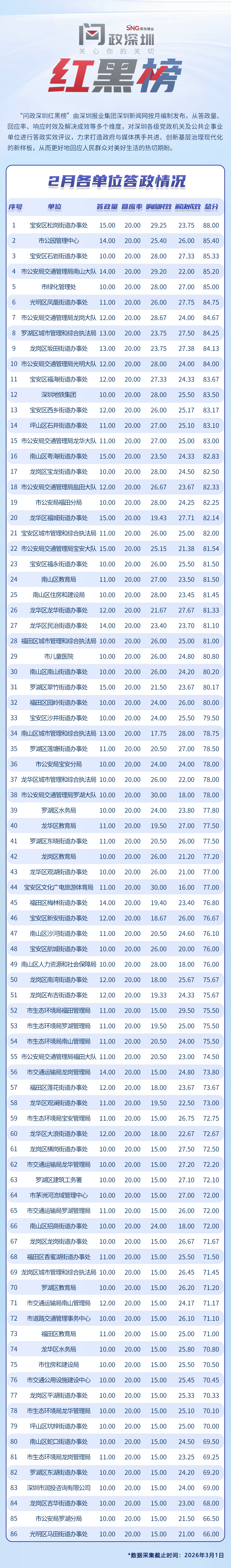 為探尋媒體如何精準賦能基層治理現(xiàn)代化的“深圳路徑”,深圳報業(yè)集團正式掛牌成立“問政深圳”工作室,旨在進一步推動網(wǎng)絡(luò)問政工作的高效開展。為確保相關(guān)工作更加契合實際需求,深圳報業(yè)集團深圳新聞網(wǎng)按照“最快速度辦結(jié)”的總體要求,將原有月度榜單創(chuàng)新升級為“問政深圳紅黑榜”,并對評分體系進行了細致優(yōu)化。該榜單從答政量、回應(yīng)率、響應(yīng)時效及解決成效等多個維度,對深圳各級黨政機關(guān)及公共企事業(yè)單位進行答政實效評議,力求打造政府與媒體攜手共進、創(chuàng)新基層治理現(xiàn)代化的新樣板,從而更好地回應(yīng)人民群眾對美好生活的熱切期盼。